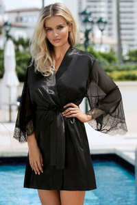 041 Nadia Elegancki Szlafrok Damski De Lafense czarny – Wiskozowy, Ażurowa Koronka, Rękaw 7/8, Kobiecy Komfort
