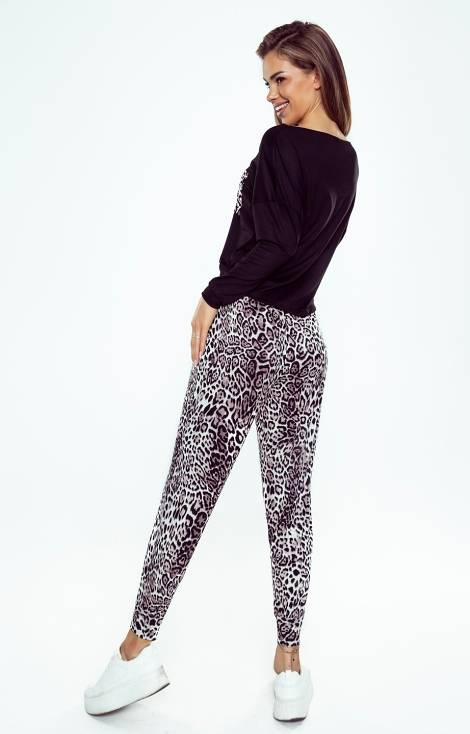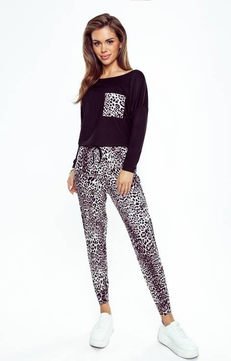 Efektowna piżama damska wykonana z miękkiej dzianiny wiskozowej. Czarna bluza, luźno osadzona na ramionach, spodnie, które przykuwają wzrok. Nogawki i rękawki zakończone ściągaczem. Na wysokości piersi ozdobna kieszonka.