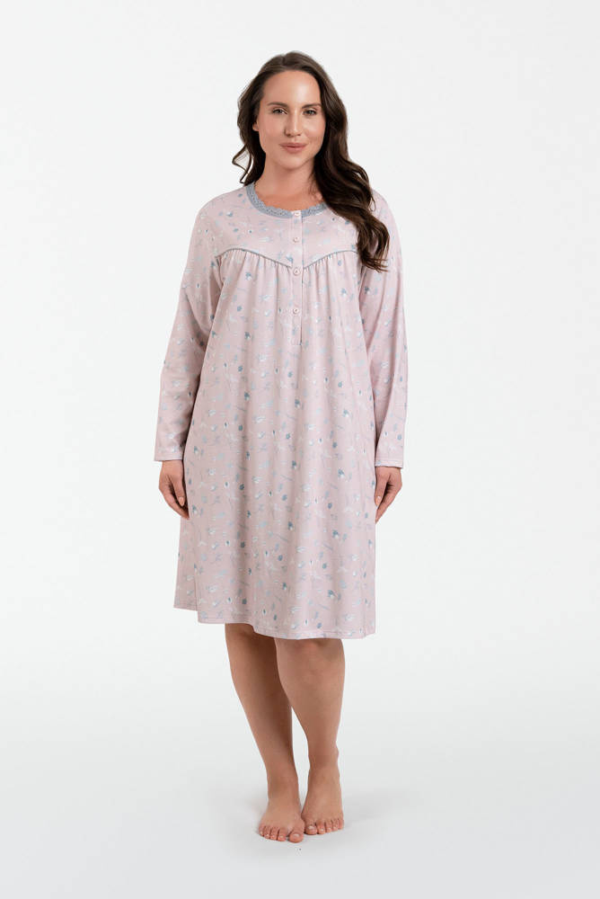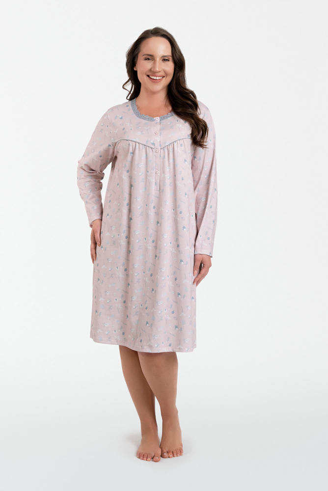 Damska koszula nocna w stylu retro to świetny pomysł na prezent! Zachwyci uroczym krojem i równie ślicznym, delikatnym wzorem w żołędzie, a szczególne wykończeniem – kilkoma guziczkami, okrągłym dekoltem z koronkom i przeszyciami nad biustem. Naturalny materiał damskiej koszuli nocnej zapewni skórze przyjemność, a prosty fason zadba o wygodę podczas snu. Długość do kolan sprawia, że bawełniana koszula nocna gwarantuje komfort i wygodę. Damska stylowa koszula nocna dostępna jest w rozmiarach od M do XXXL, w odcieniach różu i szarości.