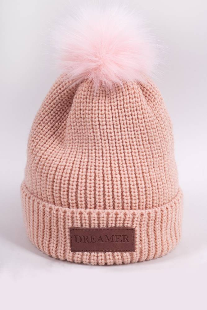 Czapka dziewczęca z puchatym pomponem wykonana z miękkiej dzianiny w prążek