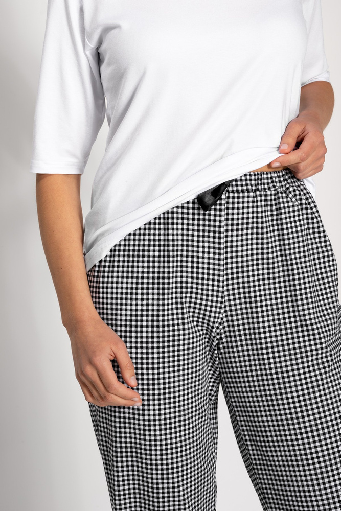 Elegancka i stylowa piżama damska.  Zaprojektowana i uszyta w Polsce. Dekolt półokrągłe, spodnie długie, w pasie gumka. Wykonana z delikatnego materiału. Nie powoduje podrażnień i nie odkształca się po praniu. Idealna również jako homewear.