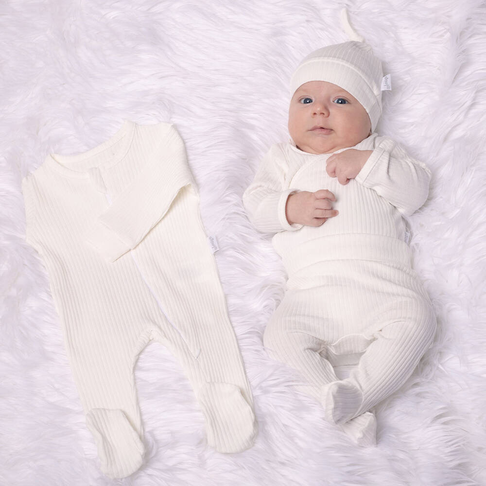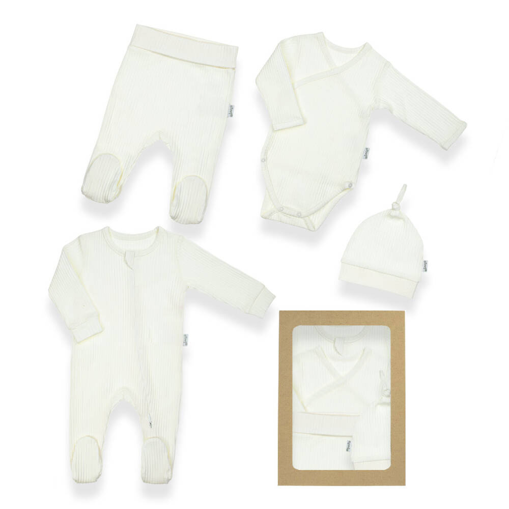 Komplet niemowlęcy, który składa się z półśpioszków, pajaca, czapeczki i body. Zapakowany w pudełko. Całość uszyta z 100% bawełny.