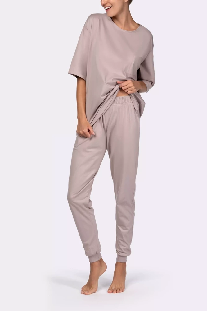 Urocza piżama damska uszyta z miękkiej i przyjemnej dla ciała bawełny. Model z oversizową, wygodną koszulką Spodnie mają nieco wyższy stan oraz szeroką gumę w pasie, gwarantującą idealne dopasowanie. Wykonana z niezwykle delikatnej i przewiewnej bawełny, zapewniającej komfort podczas snu.