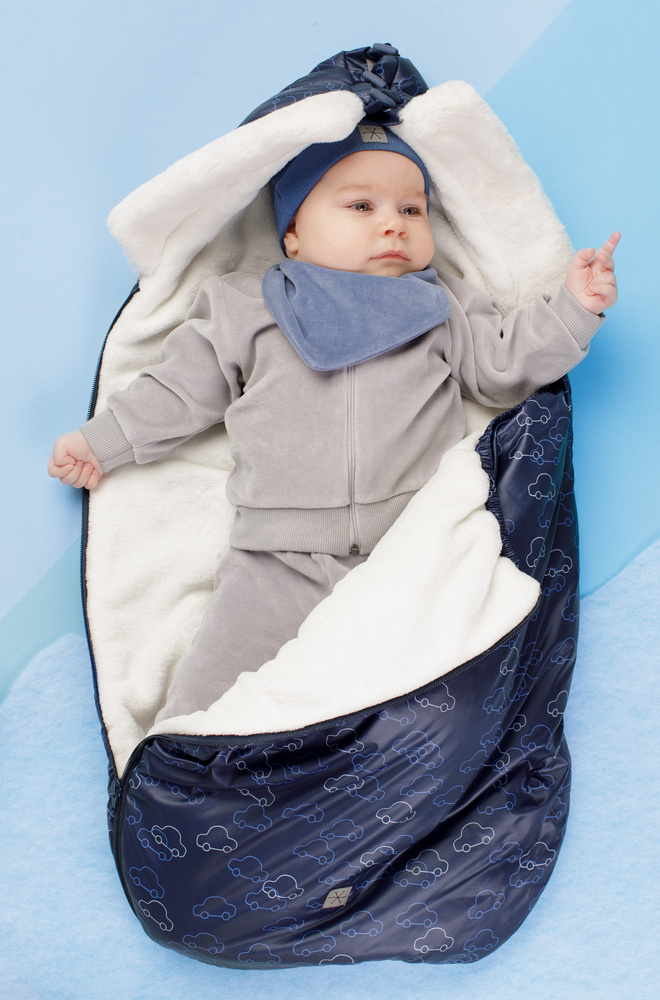 Ciepły śpiworek niemowlęcy z nadrukiem.