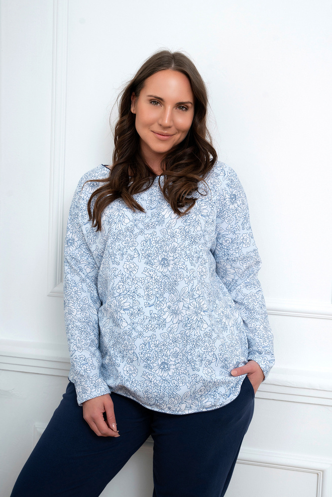 Ciepła, przyjemna dla ciała damska piżama z długimi spodniami i długim rękawem z pewnością przyda się na zimne noce zarówno w domu, jak i podczas wyjazdów. Jej luźny, prosty krój zapewni wygodę i swobodę ruchów, a przyjemny dla oka kwiatowy wzór przypadnie do gustu każdej kobiecie. Bluza damskiej piżamy wykończona jest okrągłym dekoltem i delikatnymi wcięciami w miejscu bocznych szwów, zaś spodnie są zupełnie proste, co czyni z niej klasyczny, a zarazem modny kobiecy komplet do spania. Damska piżama z dresówki dostępna jest w rozmiarach od S do XXL, w niebiesko-biało-granatowej tonacji kolorystycznej.