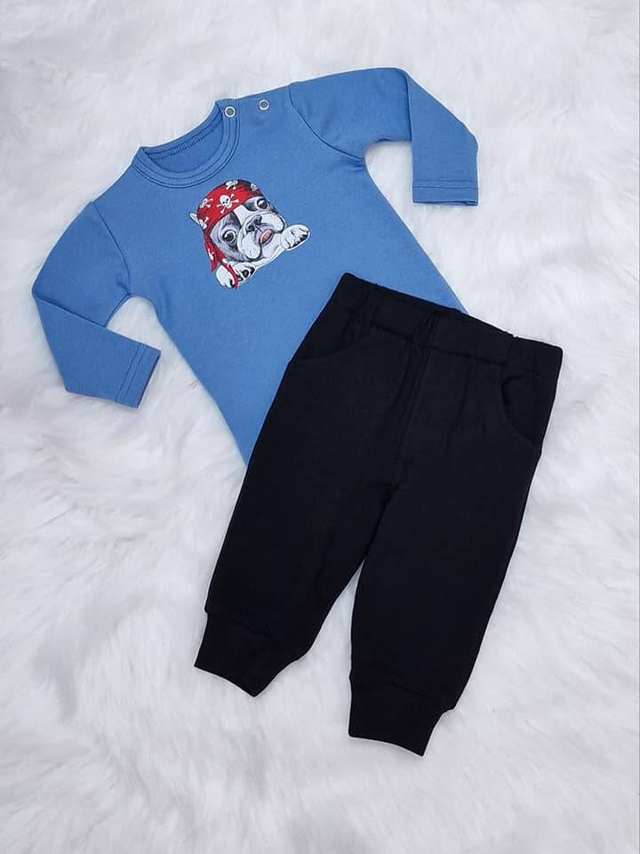 Modne spodnie dresowe wykonane z dresówki. Wszyty w pasie nieuciskający ściągacz z gumką, utrzymuje ubranko w odpowiednim miejscu. Swobodny fason spodni zapewni dziecku wygodę w trakcie nauki chodzenia, raczkowania czy zabawy. Do kompletu polecamy body Pirat