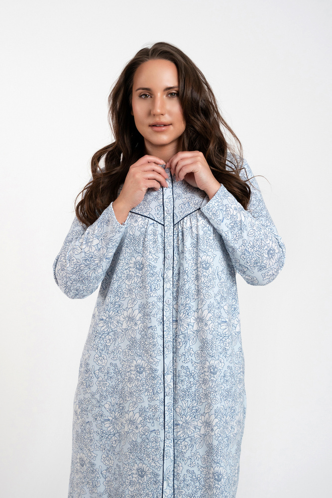 Damska rozpinana koszula nocna z długim rękawem to doskonała propozycja zarówno na lato, jak i na chłodniejsze noce. Przyjemna dla skóry 100% bawełna zapewni odpowiedni komfort termiczny, a delikatny, kwiatowy motyw przypadnie do gustu każdej kobiecie. Damska koszula nocna jest rozpinana na całej długości, posiada też zaokrąglony dekolt oraz ozdobne przeszycia, które dodają jej uroku. Ta bawełniana damska koszula do spania to gwarancja wygody i swobody każdej nocy. Damska koszula nocna dostępna jest w rozmiarach od M do XXXL i w niebiesko-białej kolorystyce.
