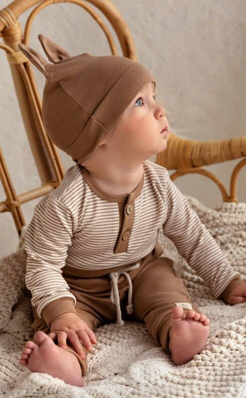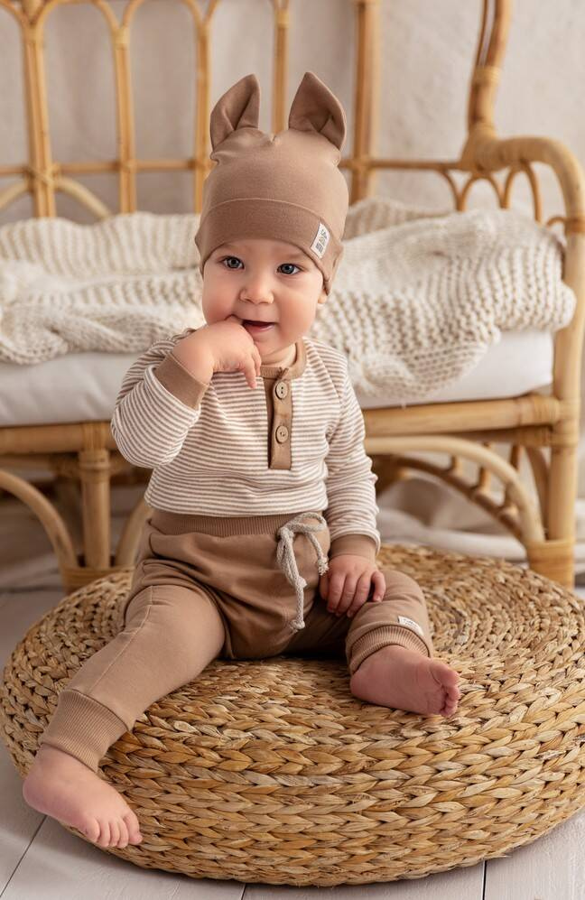 Spodnie wykonane z dresówki. Ozdobione guzikami lub sznureczkiem. W pasie wszyta jest nieuciskająca gumka, która utrzymuje ubranko na miejscu. Krój zapewnia maluchowi komfort noszenia i nie krępuje ruchów. Warto o nich pamiętać, kompletując wyprawkę dla swojego maluszka.