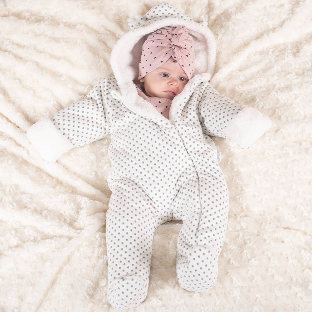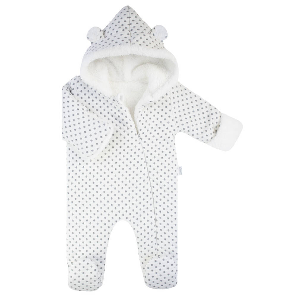 Mięciutki kombinezon rozpinany na suwaczek po całości, w rękawkach ma wszyte łapki. Podszewka w kolorze białym. Kombinezon zapewni bobasowi odpowiednią ochronę przed chłodem podczas spacerów, a do tego sprawi, że maluszek będzie się świetnie prezentować.