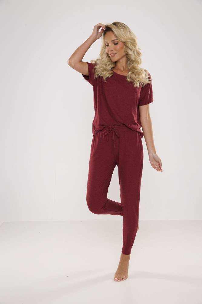 Piżama damska z wysokiej jakości wiskozy z dodatkiem elastanu. Koszulka o luźnym fasonie z krótkim rękawem typu reglan. Spodnie długie z kieszeniami, nogawki zakończone ściągaczem.