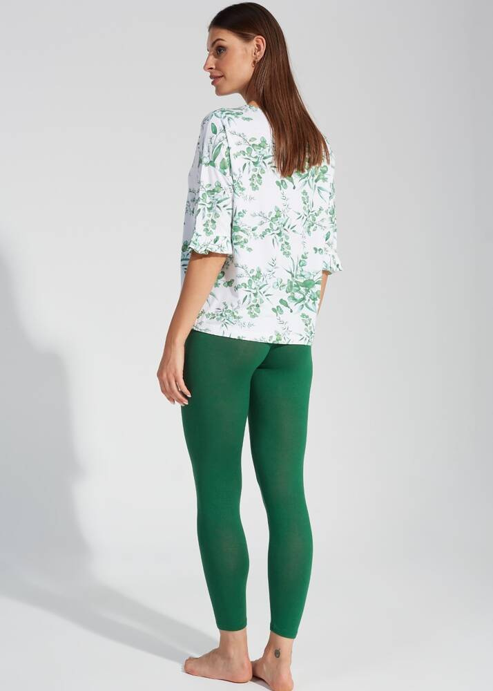 Piżama damska wykonana z wysokiej jakości wiskozy z dodatkiem elastanu. Bluza z rękawem 3/4 o luźnym i wygodnym fasonie ozdobiona roślinnym printem. Do kompletu jednolite spodnie typu leggins. W pasie guma w tunelu