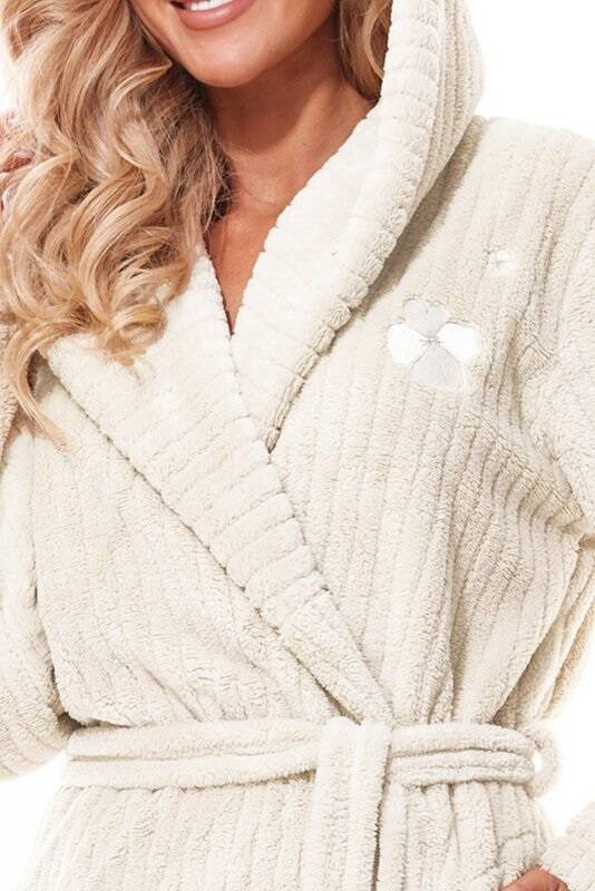 Długi szlafrok damski z kapturem ozdobiony delikatną aplikacją