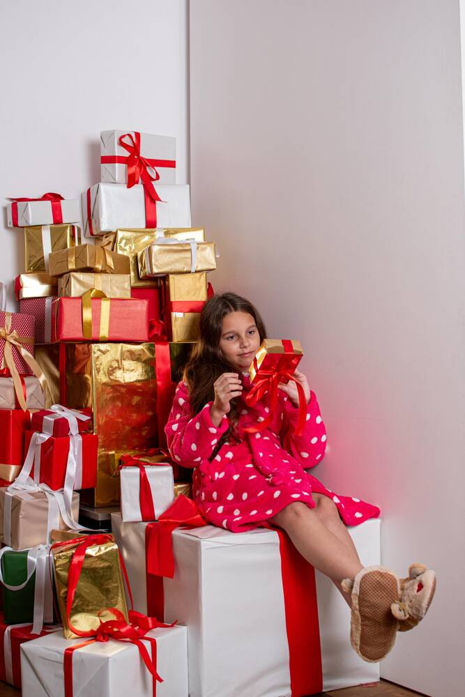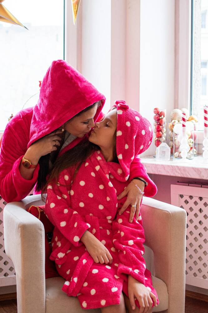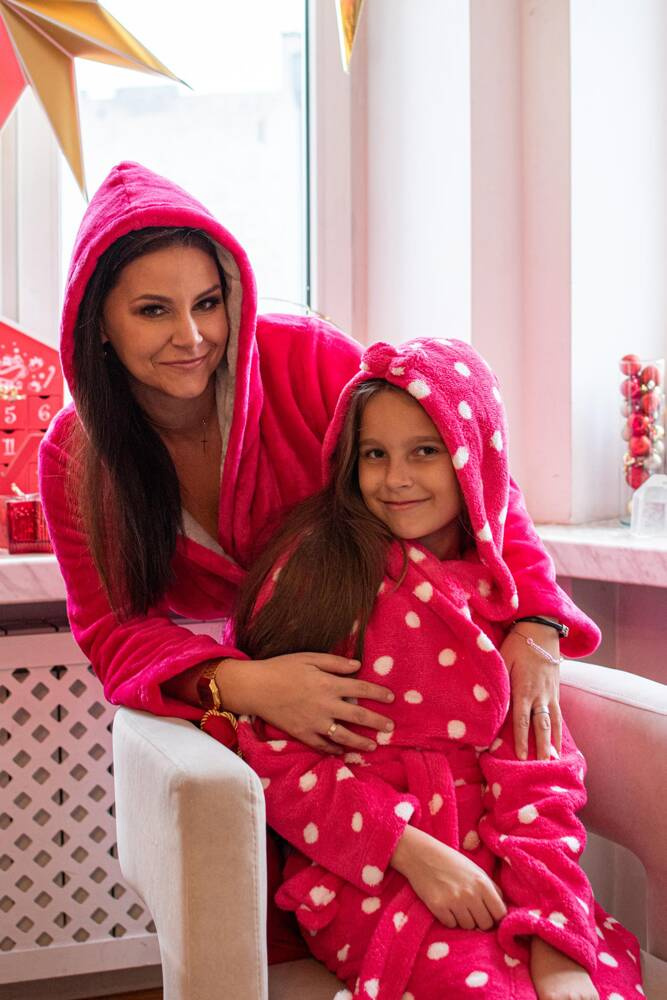Szlafrok dziecięcy firmy FOREX o prostym kroju z kapturem. Długość do kolana, po bokach kieszenie, w pasie wiązany na pasek. Całość w groszki. Szlafrok świetnie dopasowuje się do kształtu ciała, jest niezwykle miękki i lekki, wykonany z dzianiny typu soft. Otulenie się nim po kąpieli to sama przyjemność!