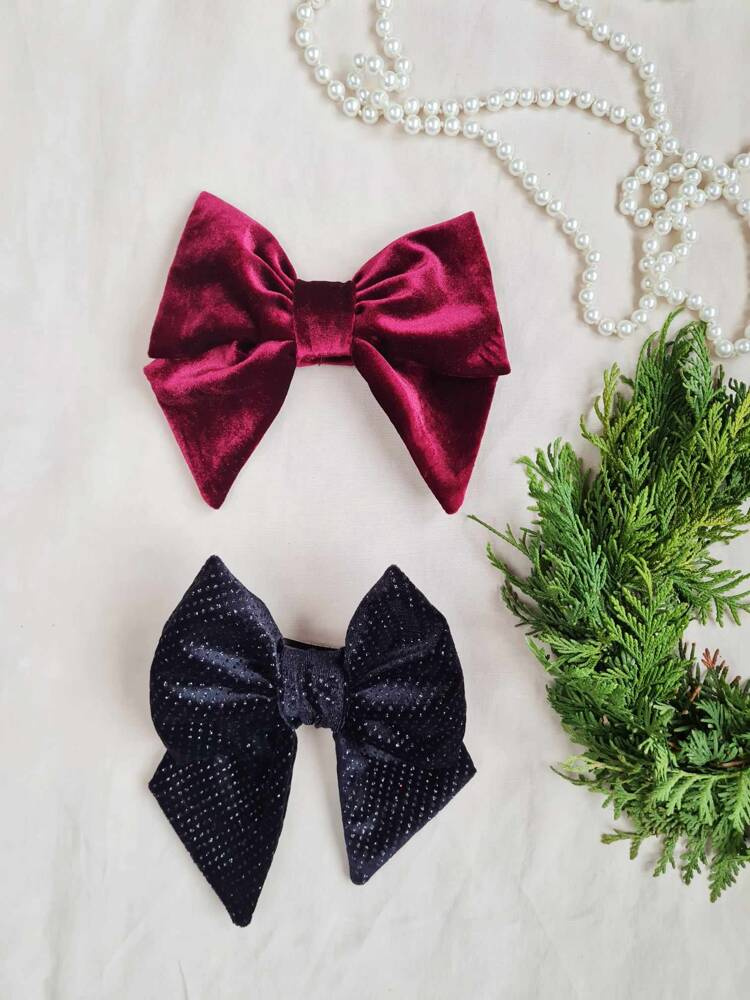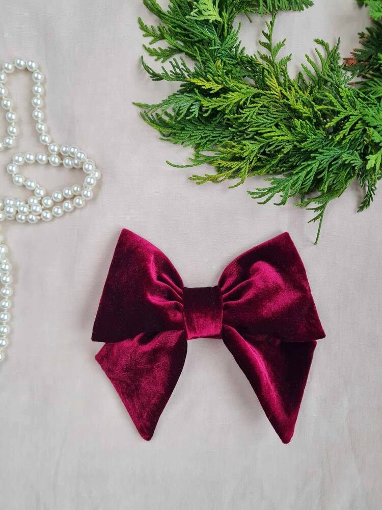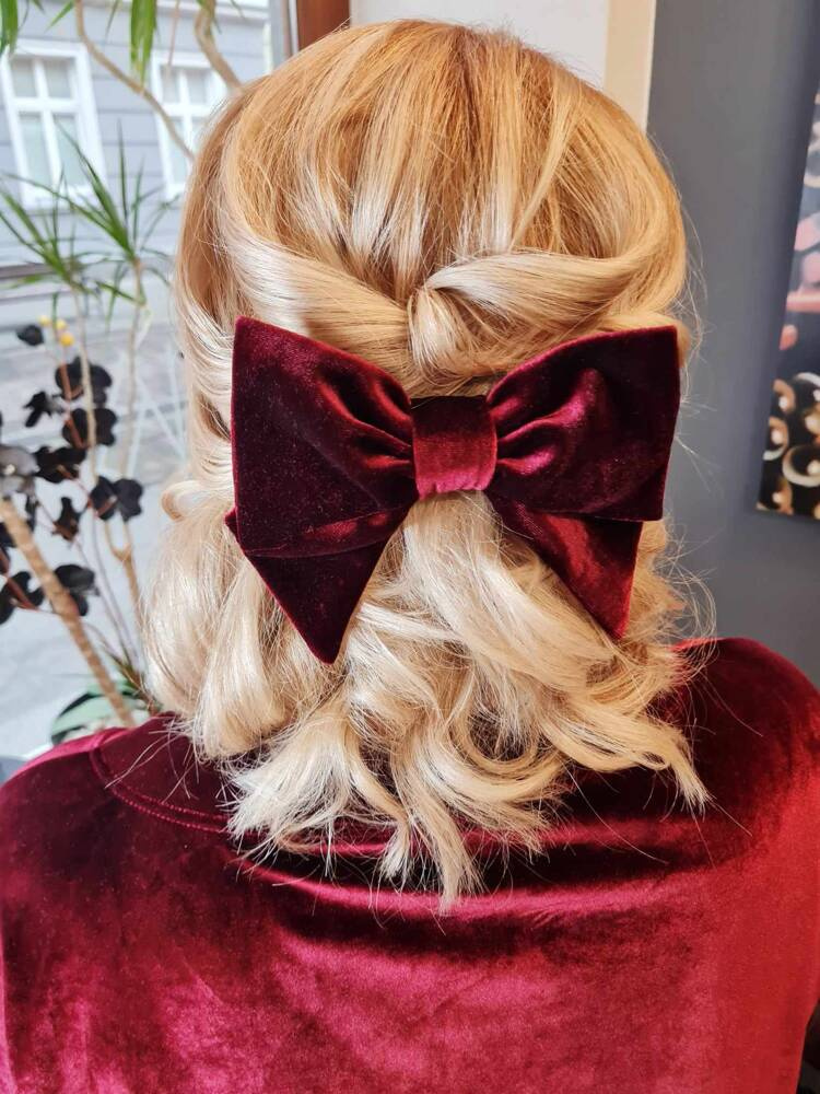 Duża, spinka do włosów. Kokarda jest uszyta z weluru. Jest przymocowana do automatycznej klamry do włosów, dzięki czemu łatwo można ją założyć i przymocować do włosów. Pasuje do każdej stylizacji nie tylko świątecznej, dla kobiet i dziewczynek. Polecamy do zestawu z naszymi świątecznymi stylizacjami.