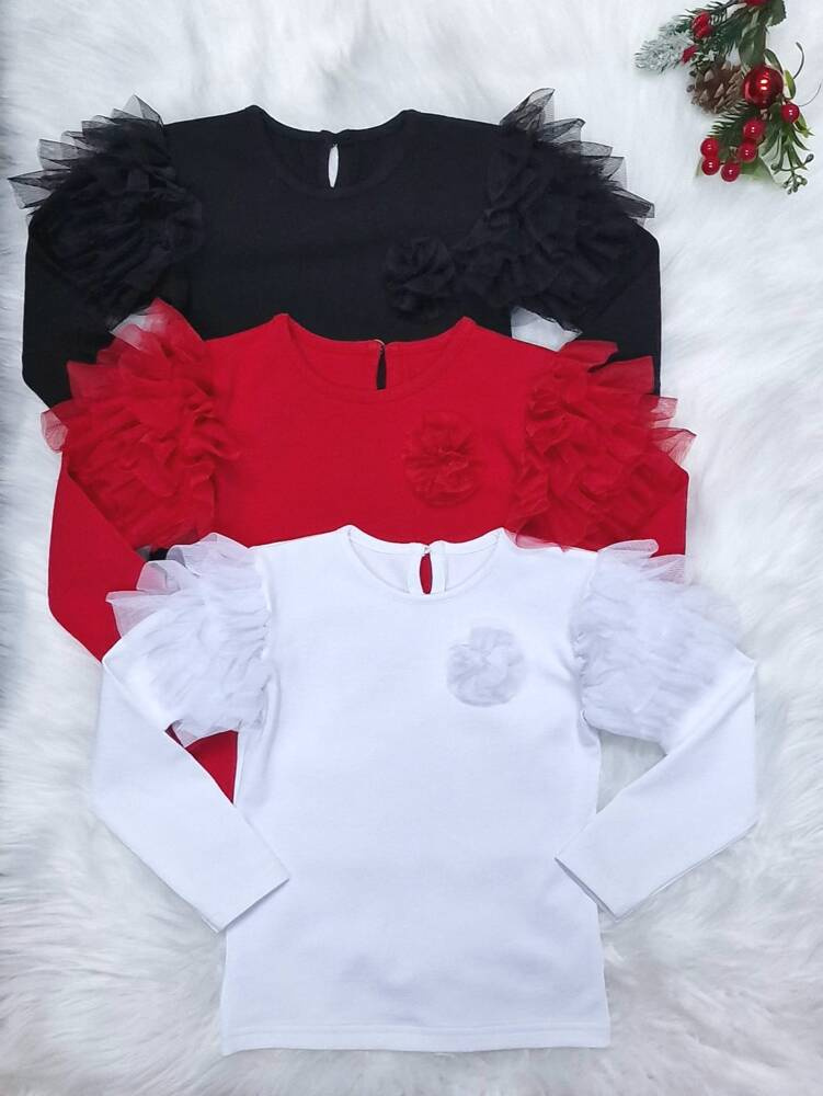 Bluzka dziecięca uszyta z miękkiej i przyjemnej w dotyku bawełny. Ozdobiona tiulowymi rękawkami. Stylizację uzupełnia spódniczka Inez. Modny krój, elegancja i niepowtarzalność!