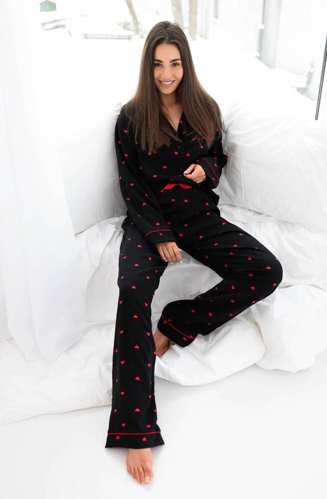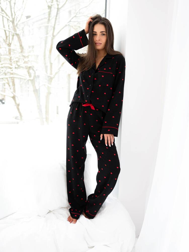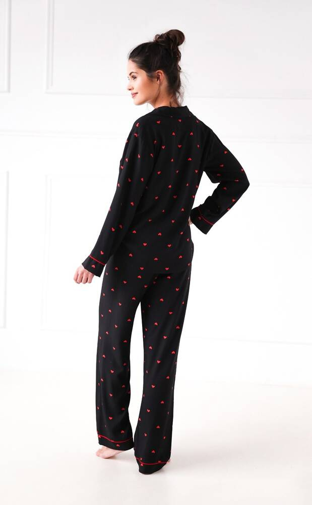 Piżama damska w serduszka wykonana z wysokiej jakości wiskozy. Rozpinana bluzka z kołnierzykiem.