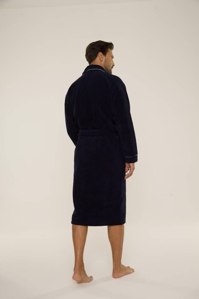 Długi welurowy szlafrok męski. Model z szalowym kołnierzem, wiązany w pasie, z dwoma naszytymi kieszeniami po bokach i jedną na wysokości klatki piersiowej. Wykonany z 50% miękkiej bawełny typu frotte. Materiał przyjemny w dotyku, idealnie wchłaniającej wodę.
