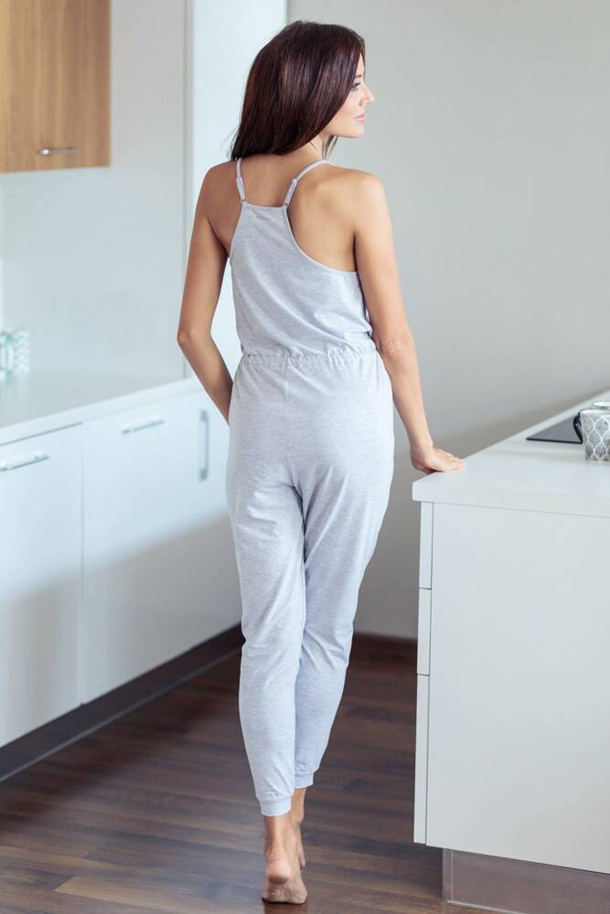 Kombinezon na regulowanych ramiączkach. Dekolt zapinany na guziki. Długie nogawki, zakończone ściągaczami. Sznurek w pasie pozwalający na regulację talii podkreśli sylwetkę i nada całości atrakcyjny kształt.