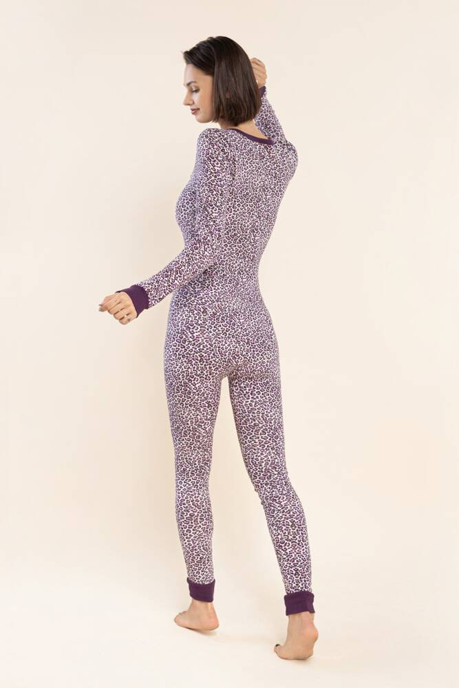 Damska piżama-kombinezon do spania to idealne rozwiązanie na zimne noce. Idealnie nadaje się na relaks z kubkiem kakao przed TV. Posiada długie rękawy i nogawki zakończone ściągaczami. Głęboki dekolt zapinany na 3 napy. Na pośladkach klapka rozpinana również za pomocą nap.