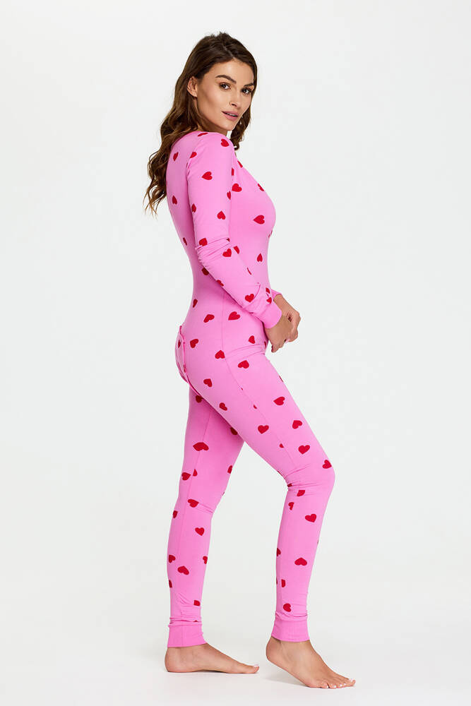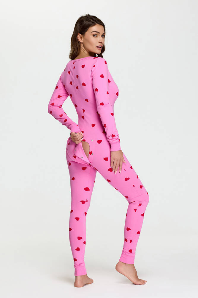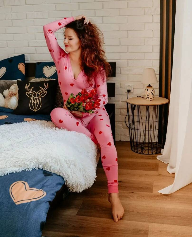 Damska piżama-kombinezon do spania to idealne rozwiązanie na zimne noce. Idealnie nadaje się na relaks z kubkiem kakao przed TV. Posiada długie rękawy i nogawki zakończone ściągaczami. Głęboki dekolt zapinany na 3 napy. Na pośladkach klapka rozpinana również za pomocą nap.