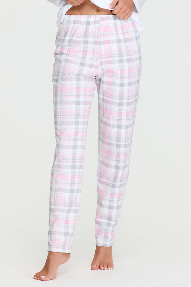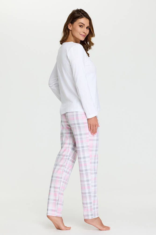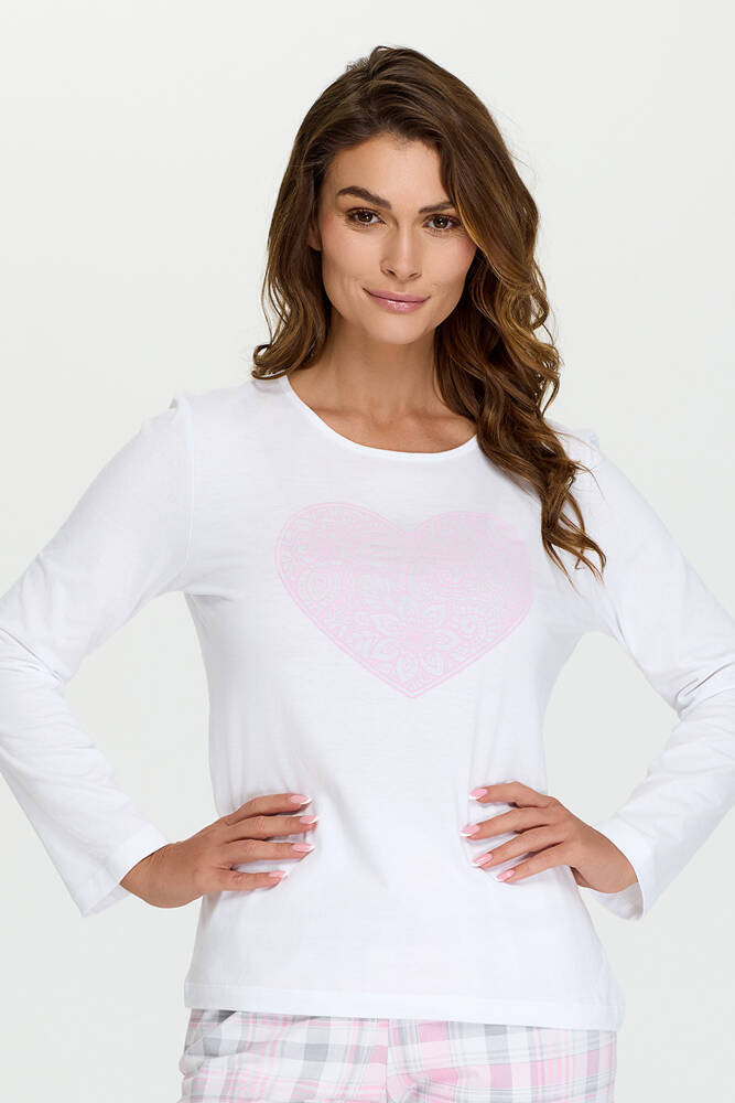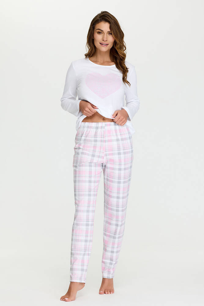 Piżama wykonana z miękkiej bawełny, zapewniająca komfort noszenia. Model o swobodnym kroju. Koszulka z długim rękawem i okrągłym dekoltem. Na przodzie ozdobny print w różowe serce. W komplecie z długimi spodniami w kratę, zwężanymi u dołu. . W pasie delikatna guma.