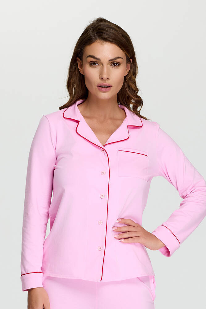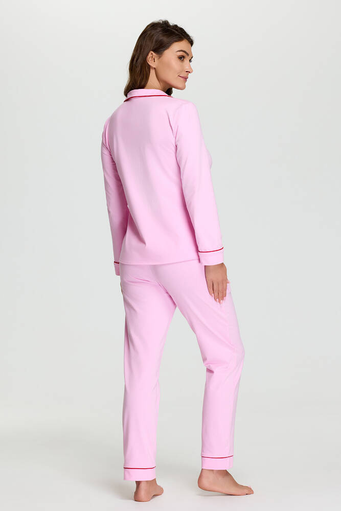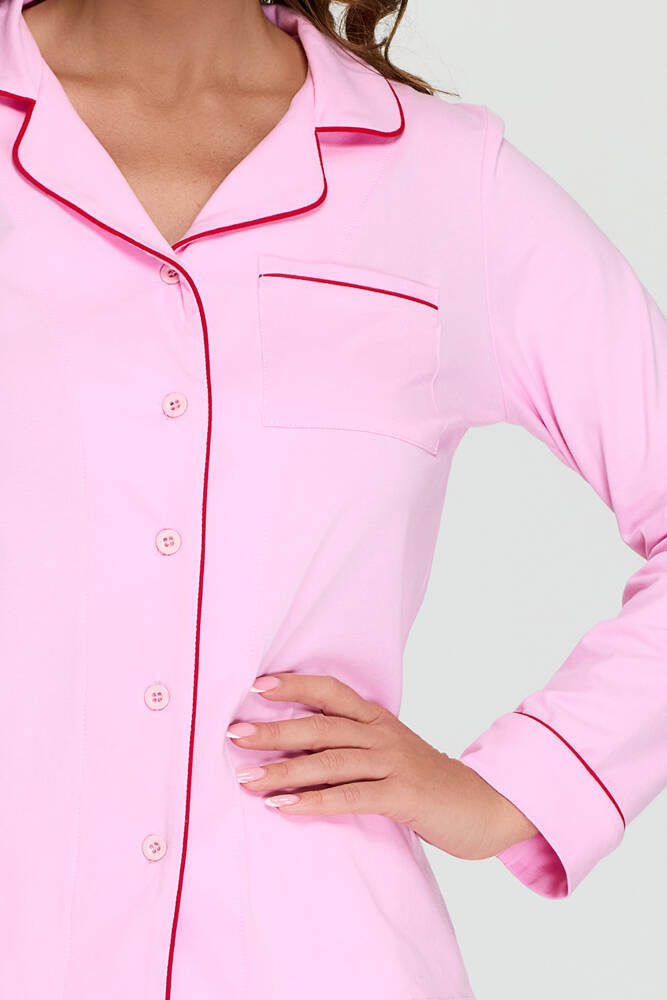 Piżama wykonana z miękkiej bawełny, zapewniająca komfort noszenia. Koszula z kołnierzykiem wykończona kontrastową, czerwoną wypustką. Zapinana na guziki. Długie rękawy zakończone mankietami. Kieszeń na wysokości piersi. W komplecie z długimi spodniami. Posiadają kieszenie. Nogawki o prostym kroju. U dołu bawełniana wypustka. Gumka w pasie.