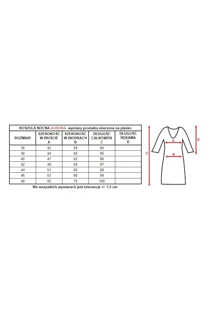 Model Aurora posiada długość "przez kolano" oraz wygodne szerokie rmiączko. Dekolt został ozdobiony uroczą koronką. Luźny, zwiewny fason pozwala na dużą swobodę ruchów. Z pewnością spodoba się także Paniom plus size.