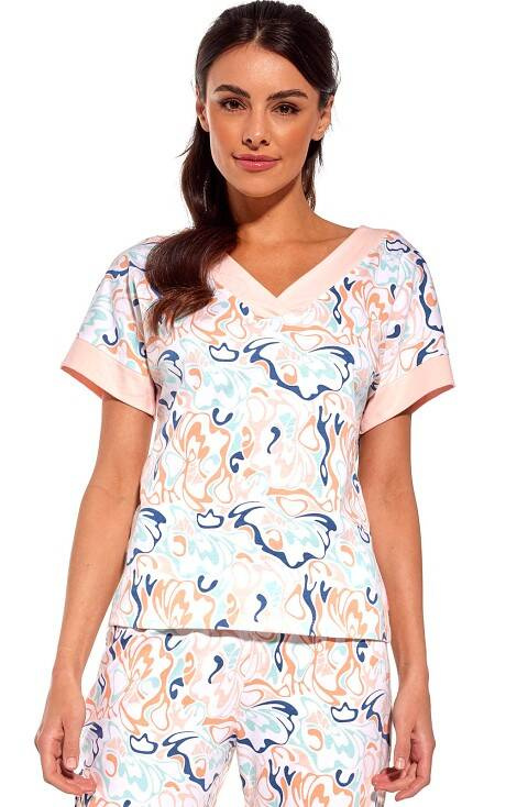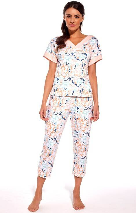 Wygodna piżama damska wykonana z wysokiej jakości wyjątkowo miłej i miękkiej bawełny. Koszulka z krótkim rękawem, dekolt w kształcie litery "V". Spodnie o długości 7/8. W pasie gumka.