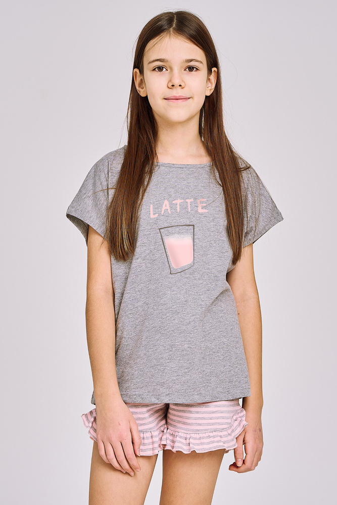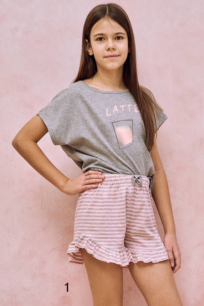 Piżama dziewczęca bawełniana. Koszulka z krótkim rękawem, ozdobiona nadrukiem. Do kompletu krótkie wzorzyste spodenki zakończone falbanką.
