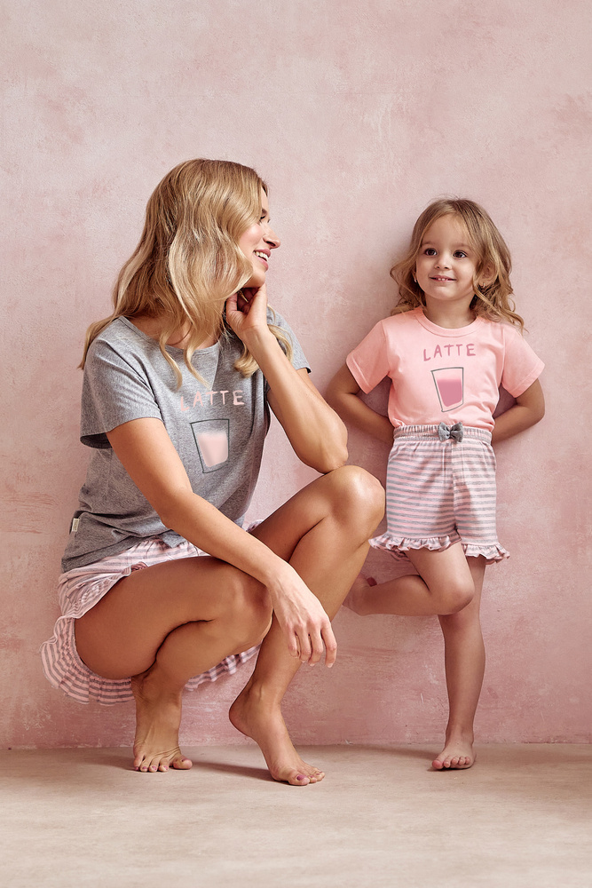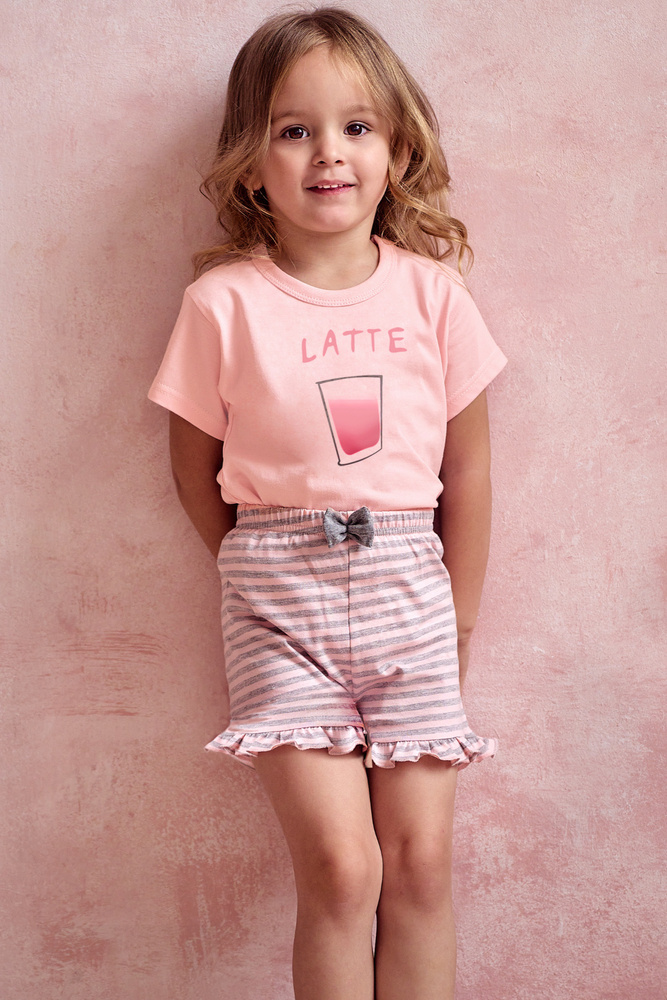 Piżama dziewczęca bawełniana. Koszulka z krótkim rękawem ozdobiona nadrukiem. Do kompletu krótkie wzorzyste spodenki.