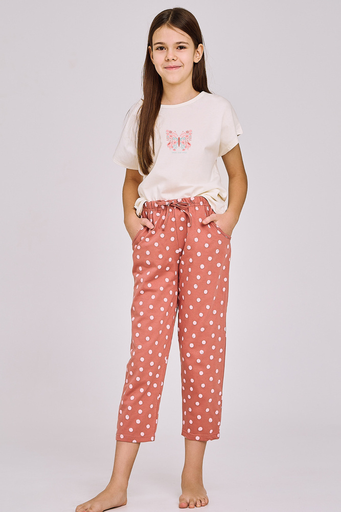 Piżama dziewczęca bawełniana, koszulka z krótkim rękawem ozdobiona nadrukiem. Do kompletu wzorzyste spodnie długości 7/8 z kieszeniami.