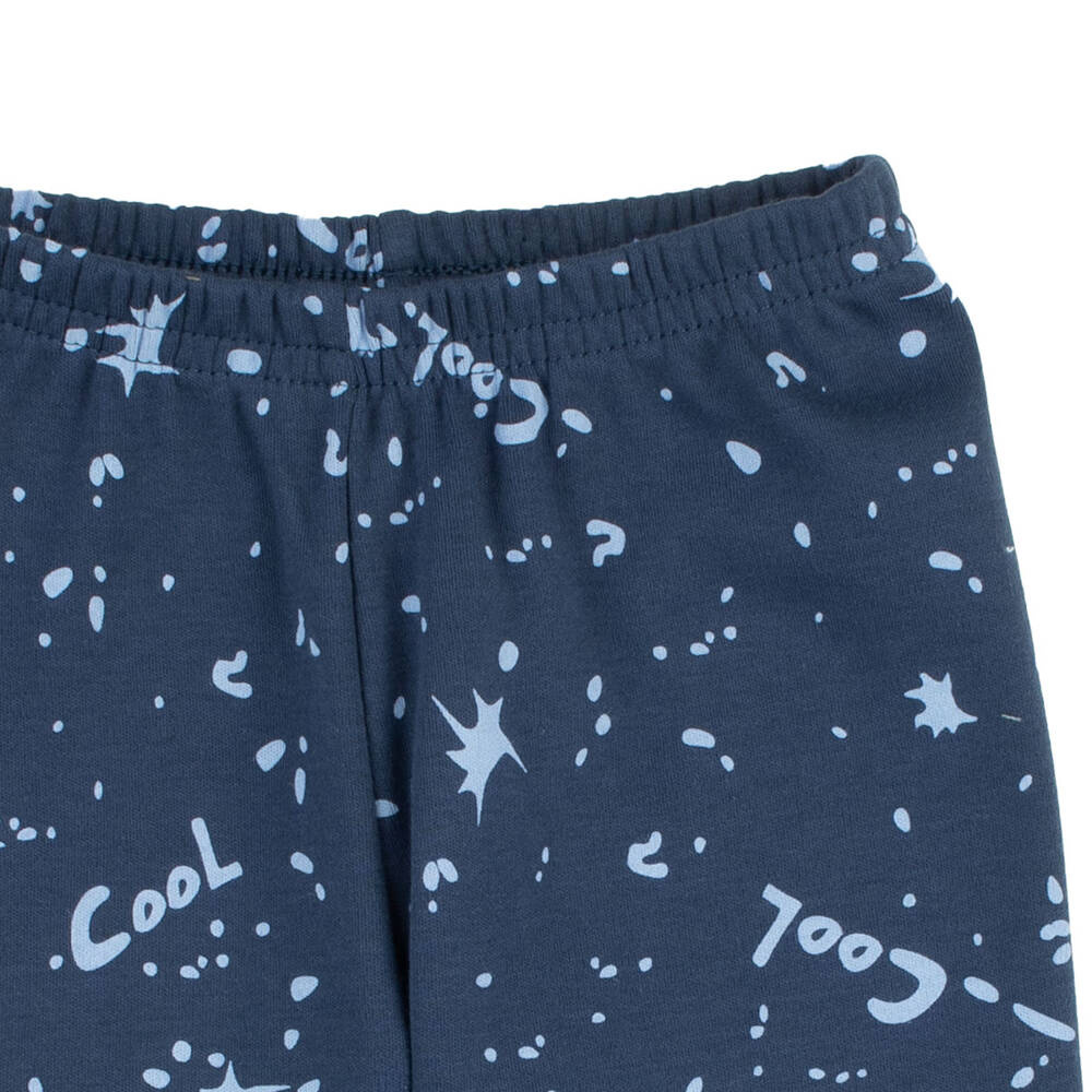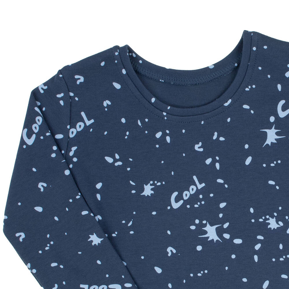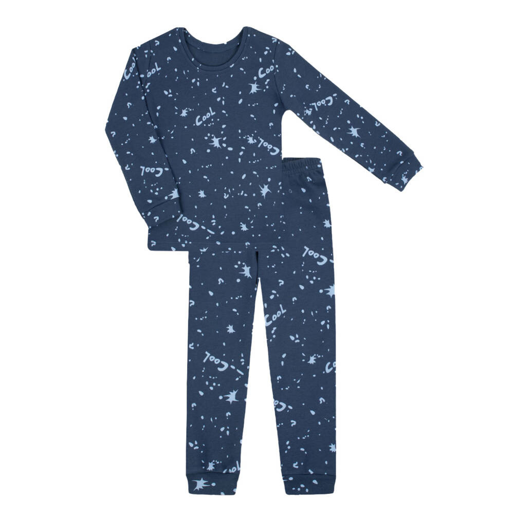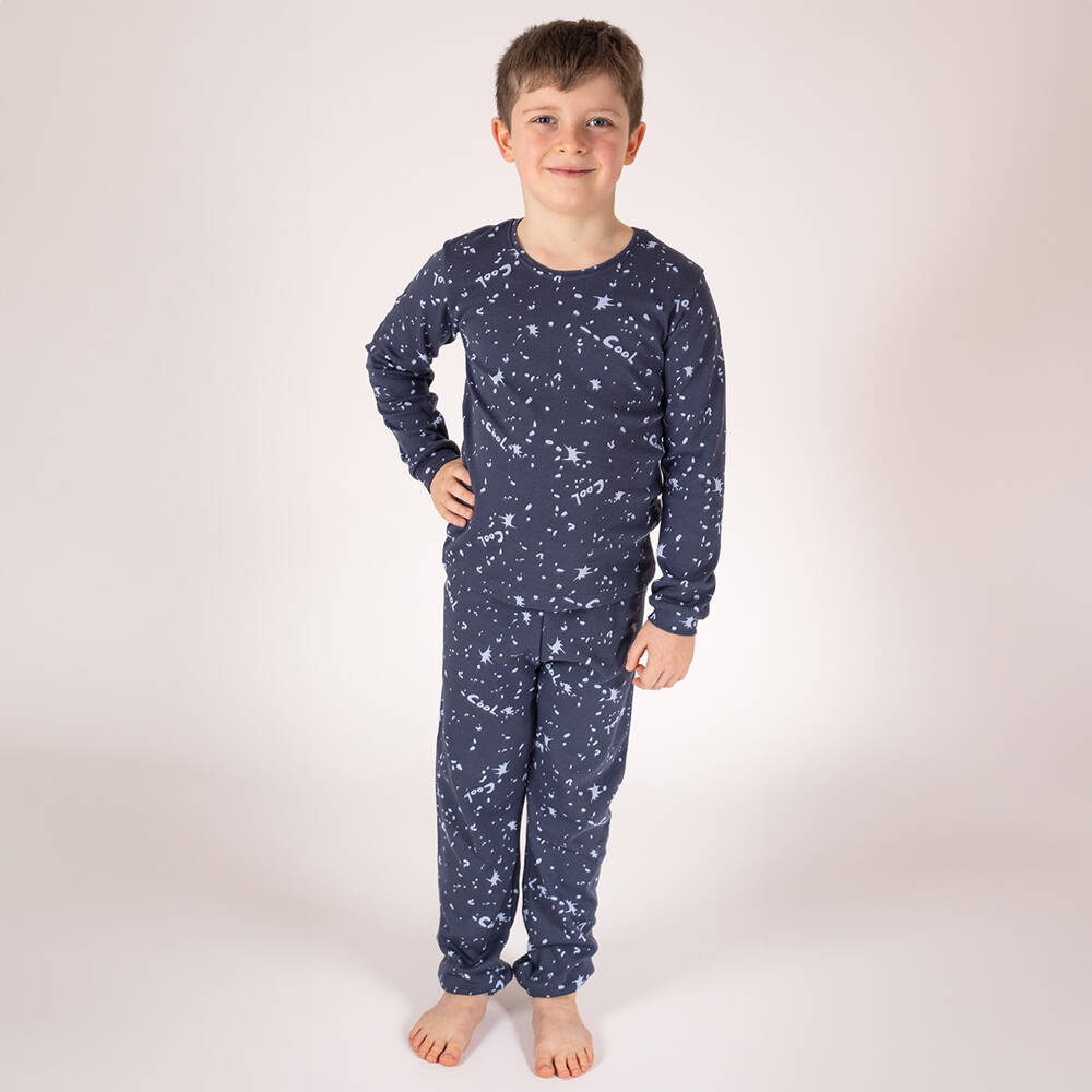 Bawełniana piżamka z kolekcji Maks dla chłopca w kolorze granatowym. Posiada luźną bluzkę z długim rękawem. Spodnie posiadają w pasie wygodną gumkę, nie uciskającą brzuszka, dodatkowo została przeszyta, aby zapobiec okręcaniu się. Dół nogawek zakończono ściągaczem. Bawełna, z której jest uszyta, posiada certyfikat Oeko-Tex Standard 100 Tekstylia godne zaufania.