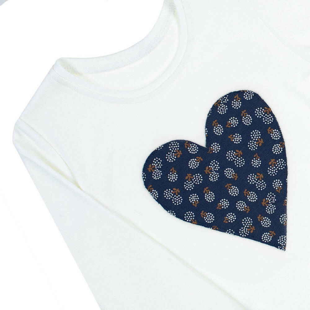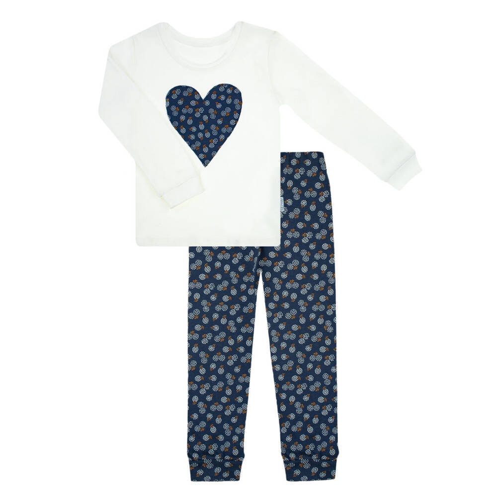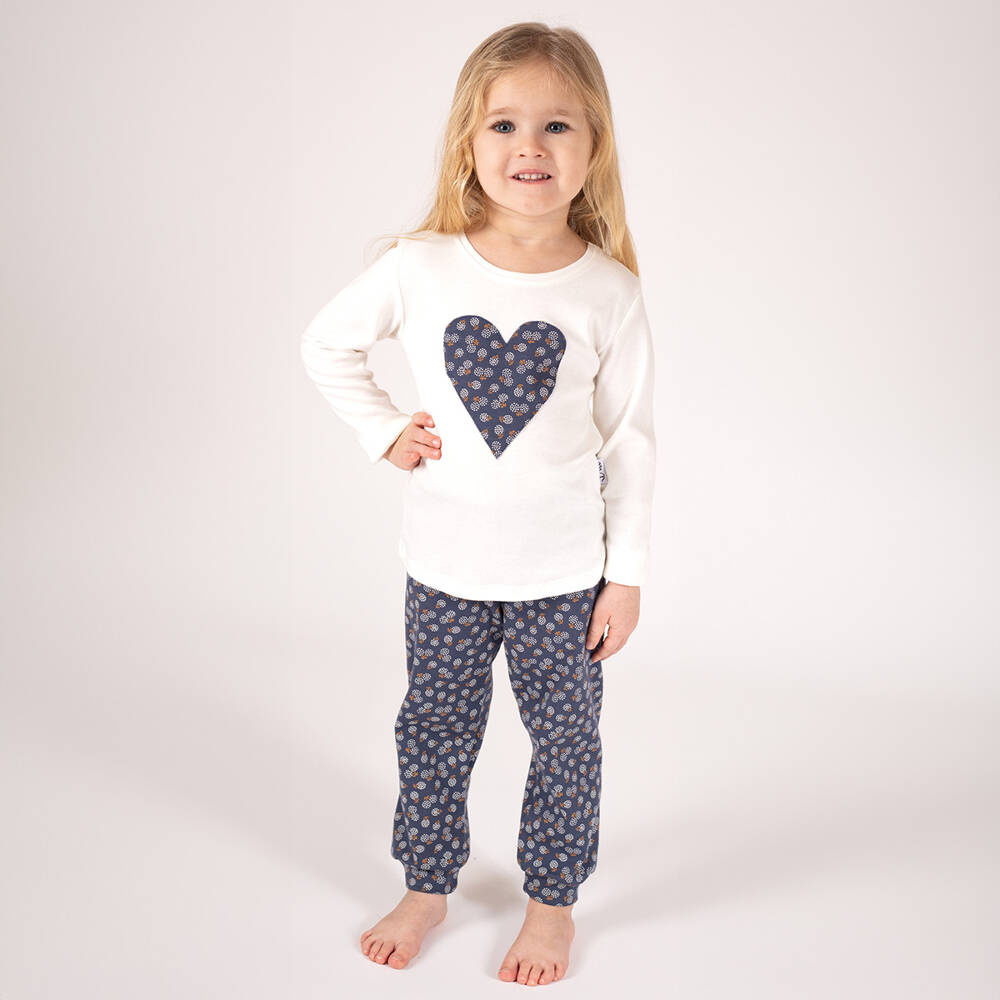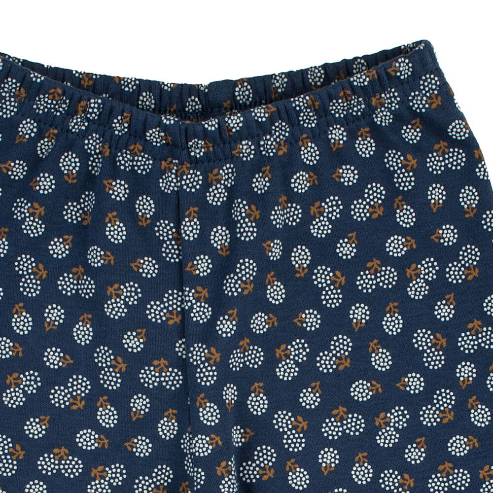 Granatowa, bawełniana piżamka dla dziewczynki w kwieciste wzorki, z luźną bluzką z długim rękawem. Spodnie posiadają w pasie wygodną gumkę, nie uciskającą brzuszka, dodatkowo została przeszyta, aby zapobiec okręcaniu się. Dół nogawek zakończono ściągaczem. Bawełna, z której jest uszyta, posiada certyfikat Oeko-Tex Standard 100 Tekstylia godne zaufania. .