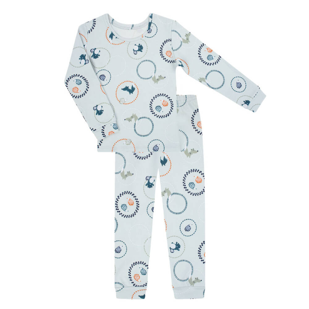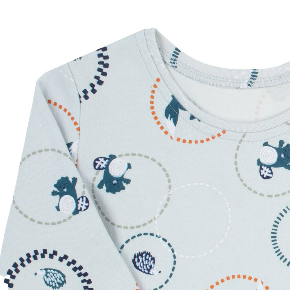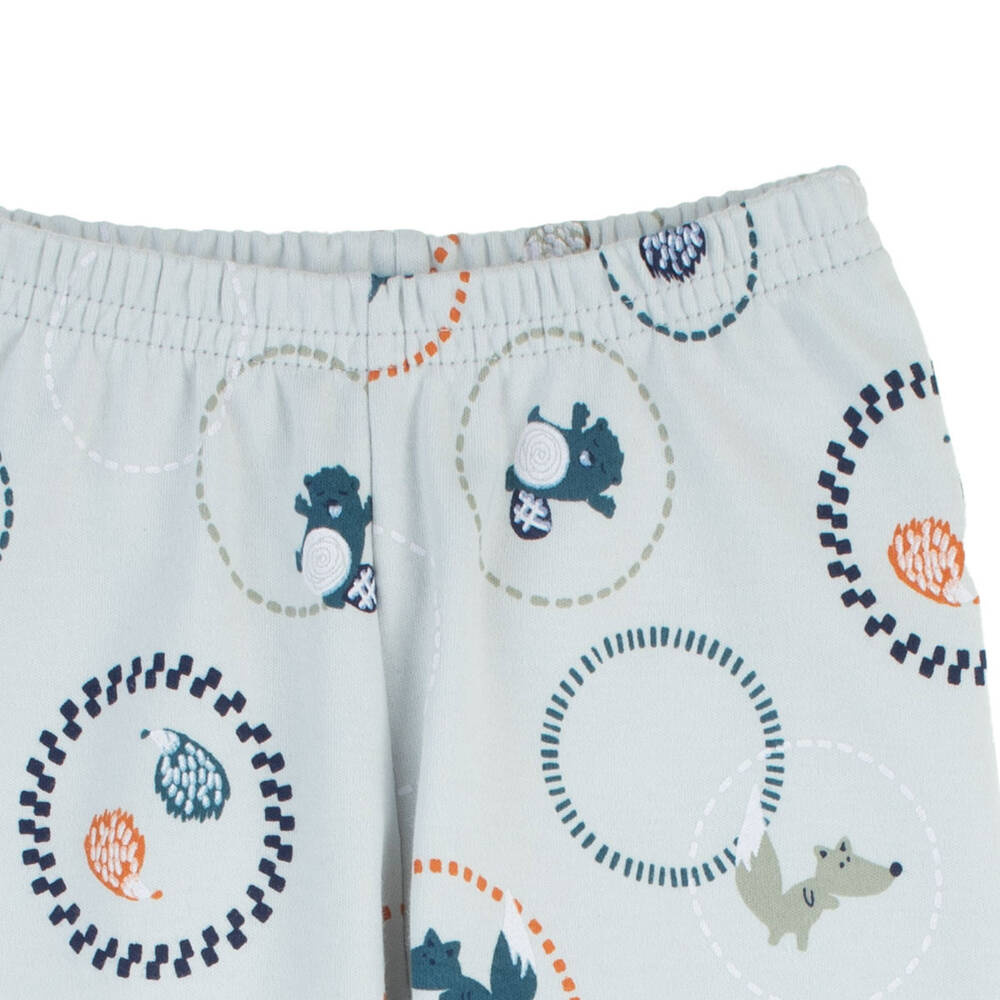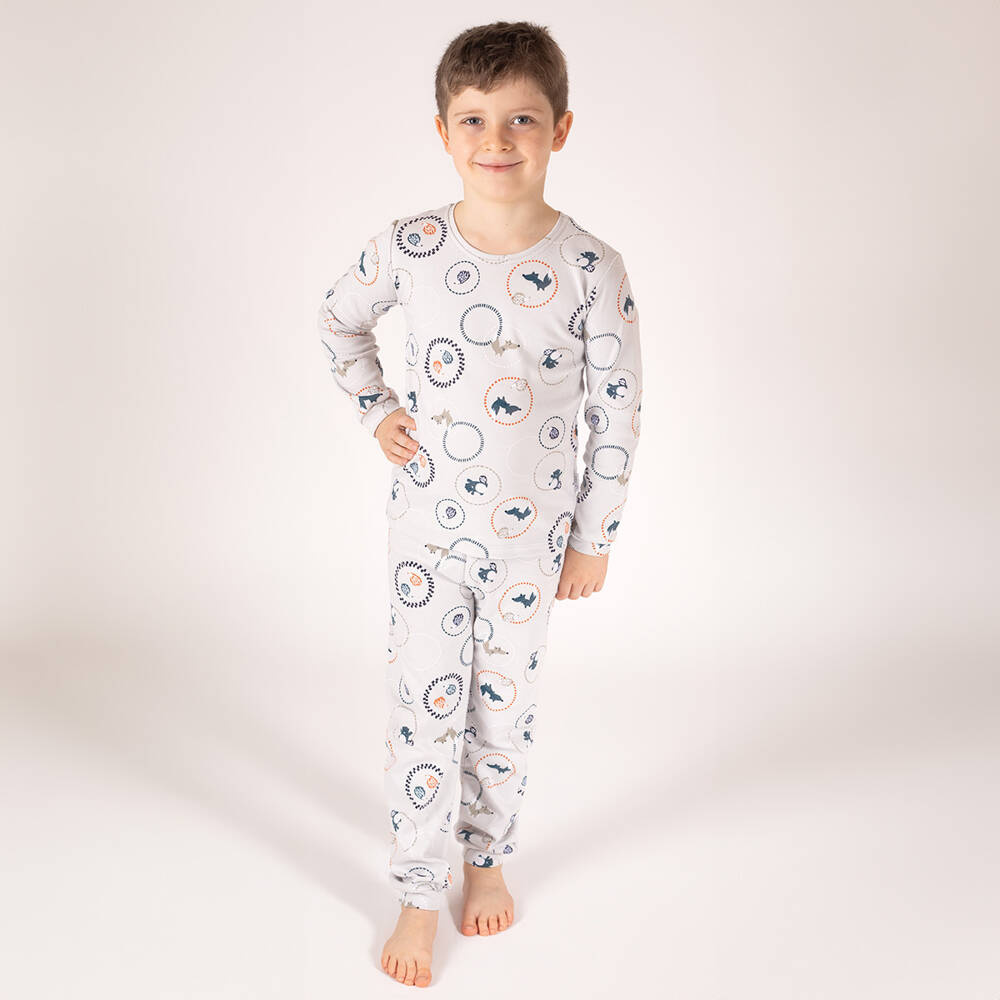 Bawełniana piżamka z luźną bluzką z długim rękawem. Spodnie posiadają w pasie wygodną gumkę nie uciskającą brzuszka, dodatkowo została przeszyta, aby zapobiec okręcaniu się. Dół nogawek zakończono ściągaczem. Uszyta z jasnopopielatej bawełny z motywem zwierzątek leśnych. Bawełna, z której jest uszyta, posiada certyfikat Oeko-Tex Standard 100 Tekstylia godne zaufania.