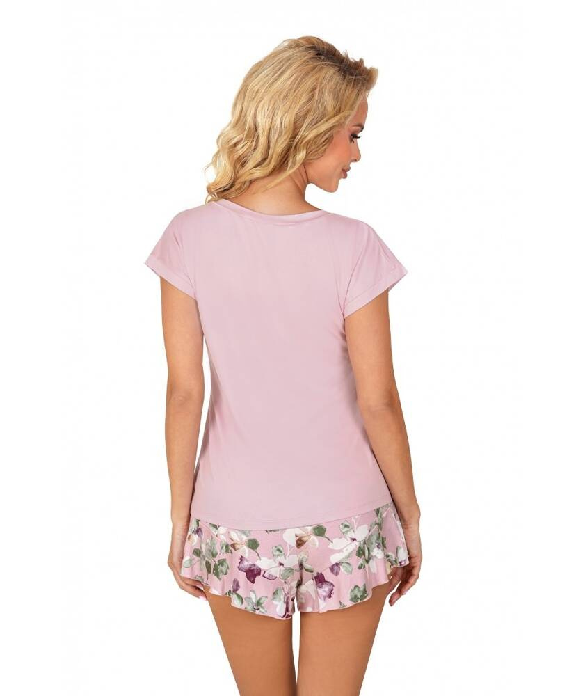 Piżama damska wykonana z delikatnej wiskozy. Koszulka z krótkim rękawem i dekoltem w kształcie litery ,,V". Do kompletu luźne, wygodne szorty.