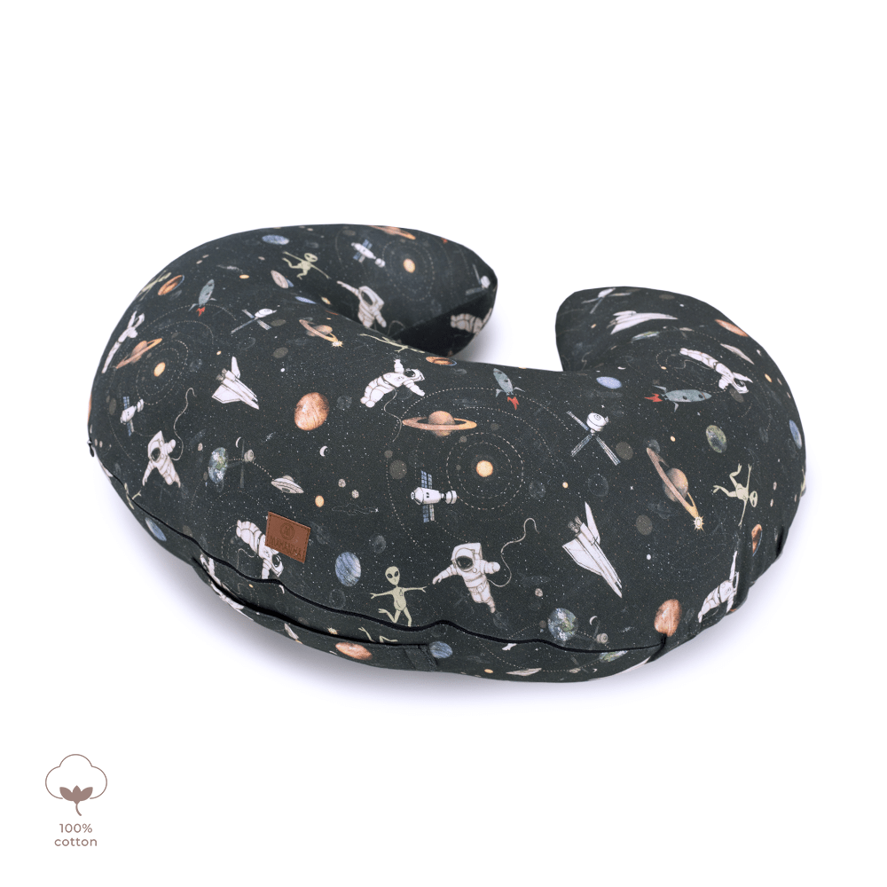 Rogal wykonany jest obustronnie z najwyższej jakości dzianiny bawełnianej, która nie spiera się i nie traci swoich właściwości nawet po wielokrotnym praniu. Poszewka zapinana na bezpieczny suwak jest łatwa do zdjęcia z poduchy i wyprania. W środku bawełniany rogal wypełniony antyalergicznym puchem silikonowym zapewniającym miękkość, a także sprężystość. Wewnętrzna część zapinana jest na niewielki suwaczek dający możliwość regulacji ilości wypełnienia. Dzięki temu poducha idealnie dopasowuje się kształtem i rozmiarem do maluszka i osoby karmiącej.