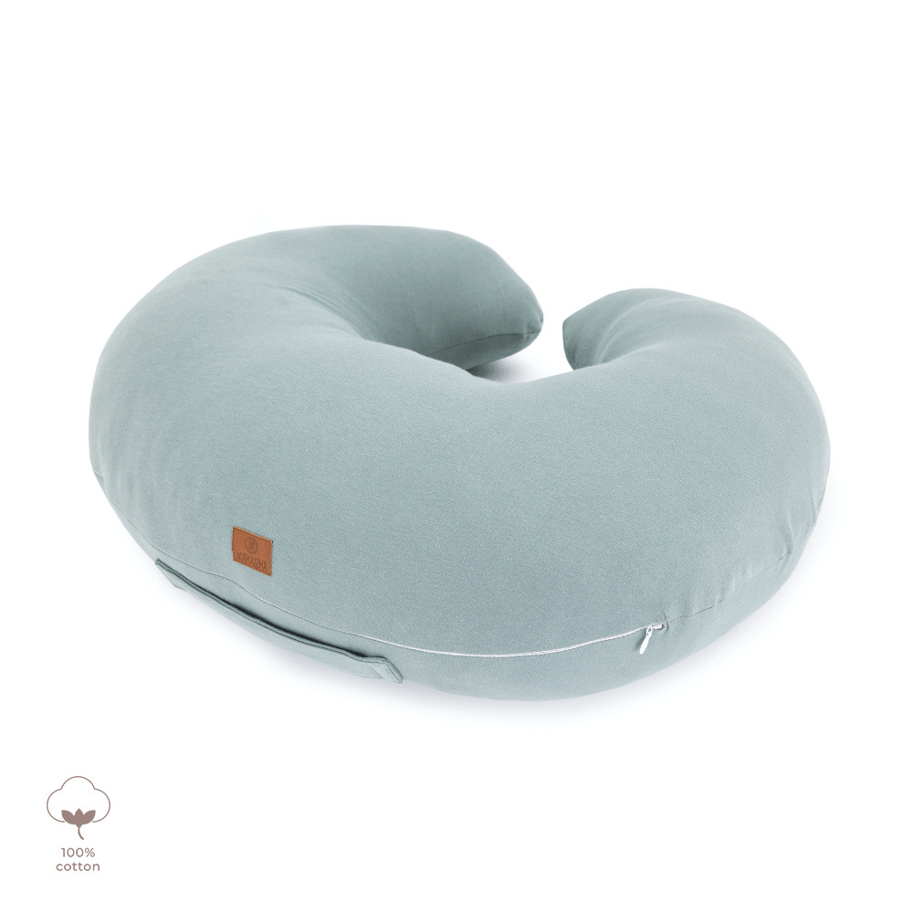 Rogal wykonany jest obustronnie z najwyższej jakości dzianiny bawełnianej, która nie spiera się i nie traci swoich właściwości nawet po wielokrotnym praniu. Poszewka zapinana na bezpieczny suwak jest łatwa do zdjęcia z poduchy i wyprania. W środku bawełniany rogal wypełniony antyalergicznym puchem silikonowym zapewniającym miękkość, a także sprężystość. Wewnętrzna część zapinana jest na niewielki suwaczek dający możliwość regulacji ilości wypełnienia. Dzięki temu poducha idealnie dopasowuje się kształtem i rozmiarem do maluszka i osoby karmiącej.