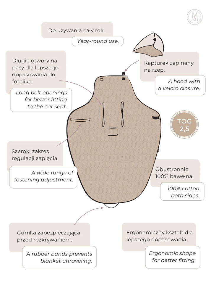 Otulacz do fotelika wyposażony jest w otwory na trzy i pięciopunktowe pasy bezpieczeństwa, zapinany jest na szeroki rzep z dużym obszarem regulacji, a w górnej części posiada zapinany kapturek, który otula i chroni główkę.