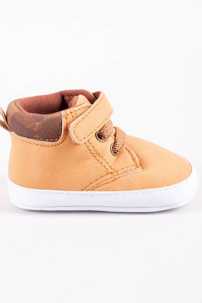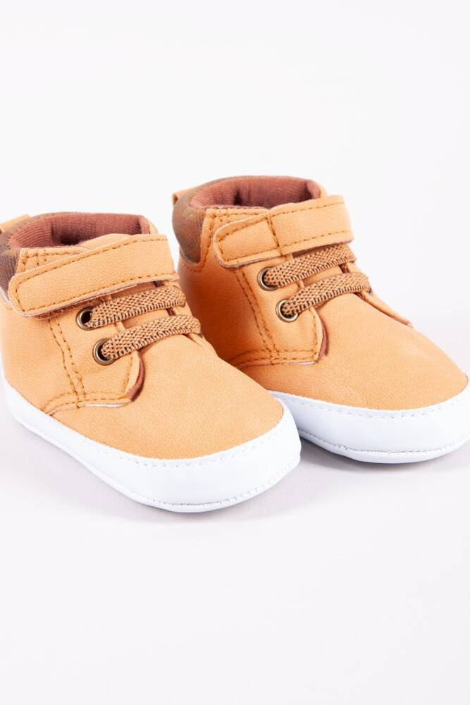 Chłopięce buciki w kolorze brązowym. Dzięki zapinaniu na rzep, można je szybko założyć i dopasować do stopy dziecka. Wykonane z dbałością o każdy detal, z wysokiej jakości materiałów.