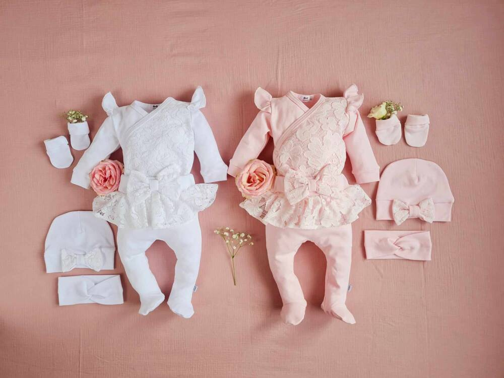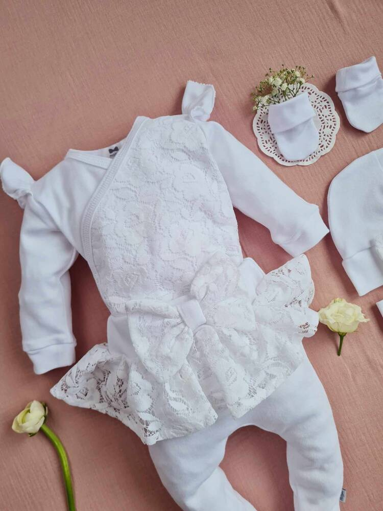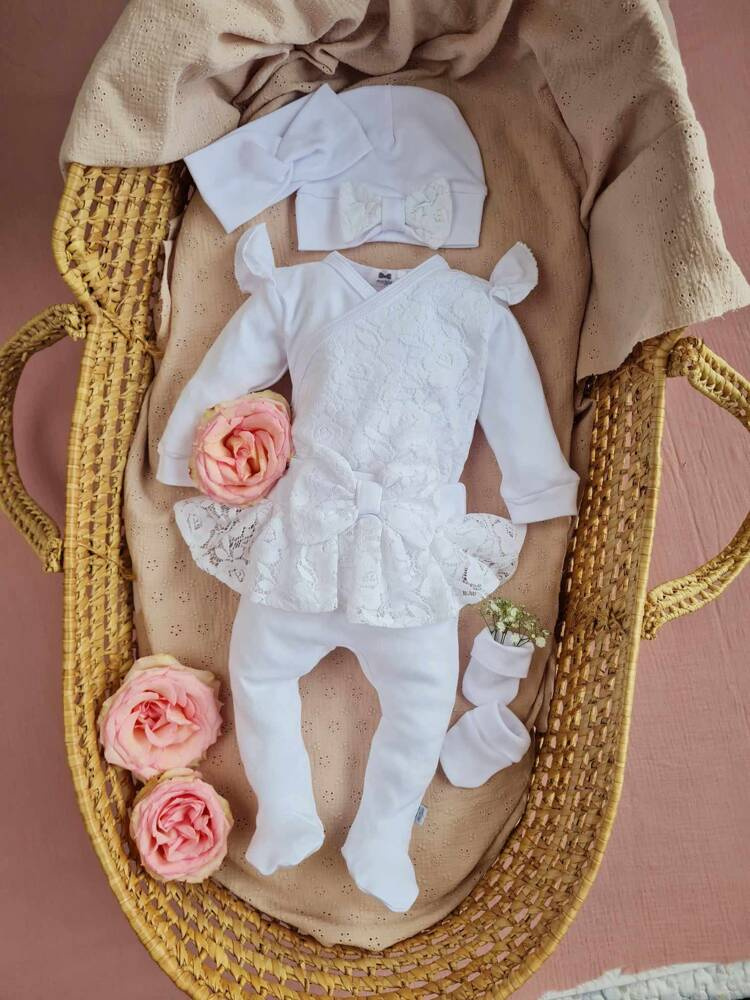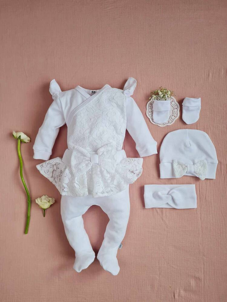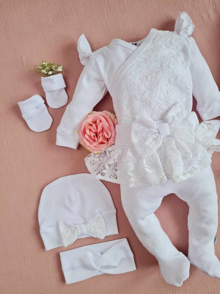 Efektowna bawełniana wyprawka niemowlęca wykończona delikatną koronką. W jego skład wchodzi body kimono z długim rękawem, półśpiochy z ozdobną kokardą, czapeczka, opaska oraz rękawiczki niedrapki. Doskonale sprawdzi się w pierwszych dniach życia maluszka.
