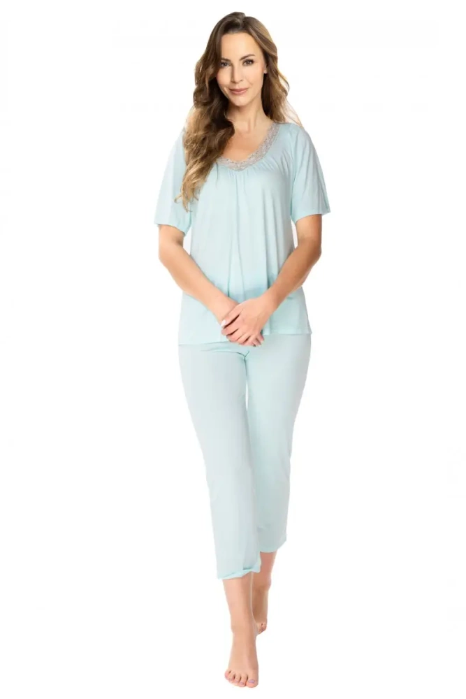Gustowna piżama ozdobiona delikatną koronką z motywem kwiatowym. Model wykonany z niezwykle miękkiej i przyjemnej dla ciała wiskozy. Góra z krótkim rękawem i praktycznym dekoltem wyciętym w kształt litery "V", ozdobiony miękką koronką. Spodnie o długości 3/4 i swobodnym kroju, na wygodnej gumie.