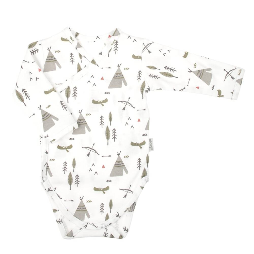 Kopertowe body z długim rękawem, uszyte z bawełny wzorowanej. Produkt jest zapinany na bezniklowe napy. Model ten polecany jest dla noworodków, ponieważ zastosowane zapięcie ułatwia ubieranie dziecka. Materiał posiada certyfikat Oeko-Tex Standard 100 Tekstylia godne zaufania.