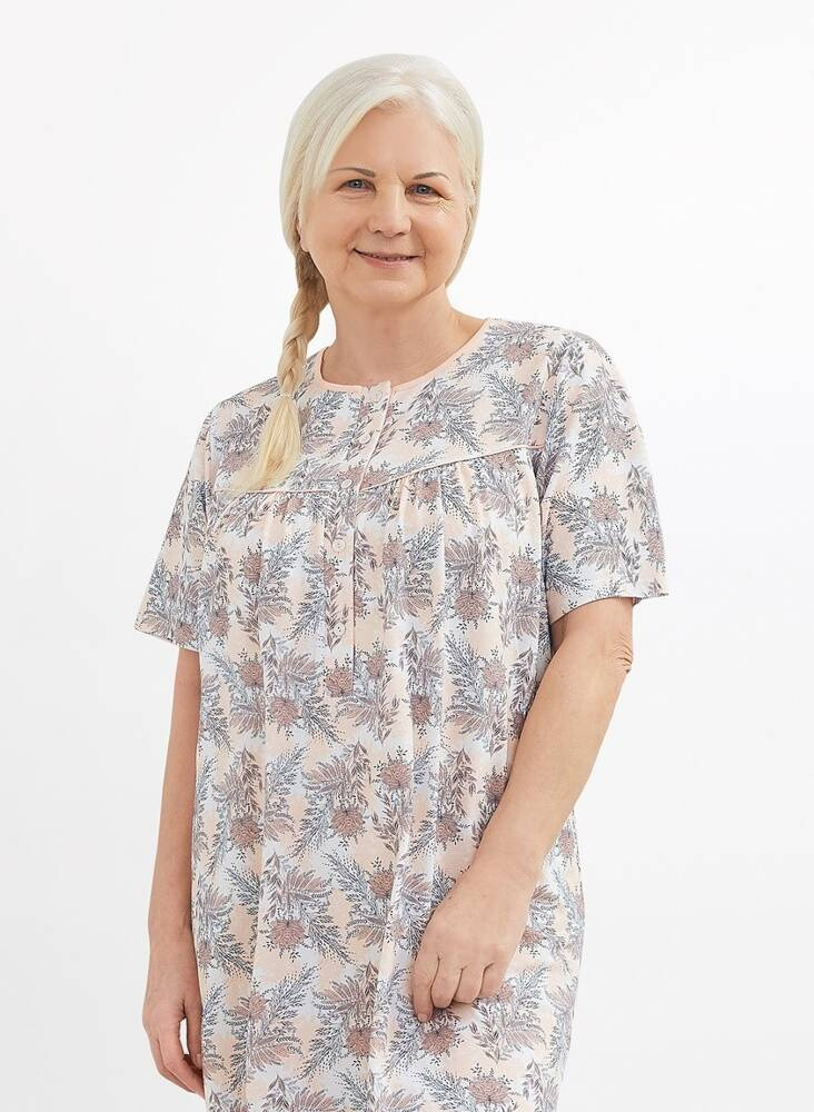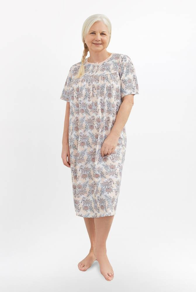 Damska rozpinana koszula nocna z krótkim rękawem to doskonała propozycja zarówno na lato, jak i na chłodniejsze noce. Przyjemna dla skóry 100% bawełna zapewni odpowiedni komfort termiczny, a delikatny, kwiatowy motyw przypadnie do gustu każdej kobiecie. Damska koszula nocna jest rozpinana na dekolcie, dzięki czemu idealnie nadaje się dla kobiet karmiących. Ta bawełniana damska koszula do spania to gwarancja wygody i swobody każdej nocy. Damska koszula nocna dostępna jest w rozmiarach od M do XXXL