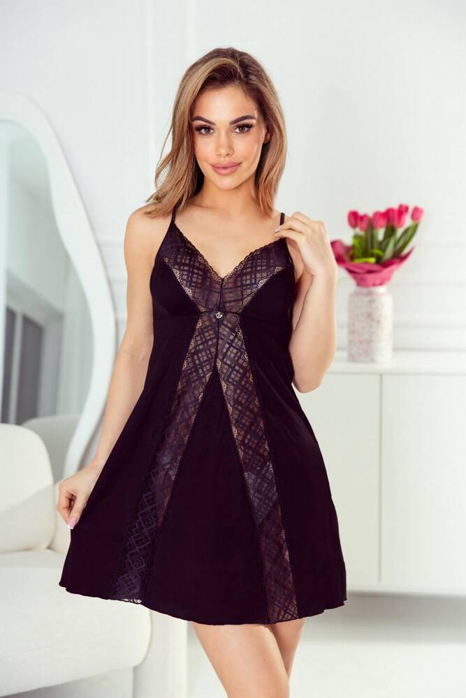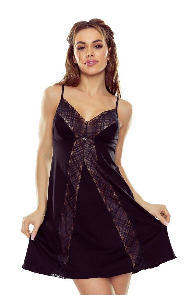 Zmysłowa koszulka damska wykonana z wysokiej jakości dzianiny wiskozowej. Dekolt i przód ozdobiony efektowną koronką o kwiatowym motywie. Długość przed kolano