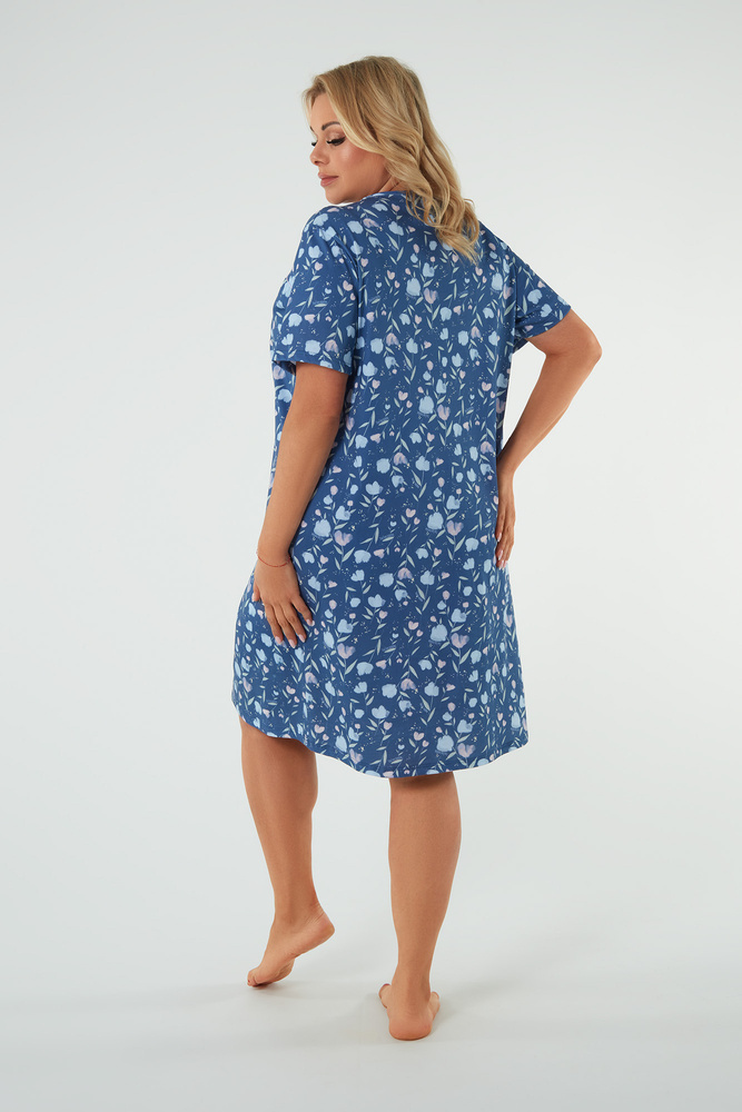 Koszula nocna z krótkim rękawkiem to wyważone połączenie elegancji, subtelności oraz wygody. Posiada ona luźny krój, który swobodnie okala sylwetkę. Na przodzie damska koszula nocna posiada dekolt w serek oraz ozdobne marszczenia. Przy dekolcie znajduje się dekoracyjna, atłasowa kokardka. Na całej powierzchni nadruk w kwiaty, który dodaje mnóstwo lekkości i kobiecego uroku. Nasza bawełniana koszula nocna ma również długość do kolan.