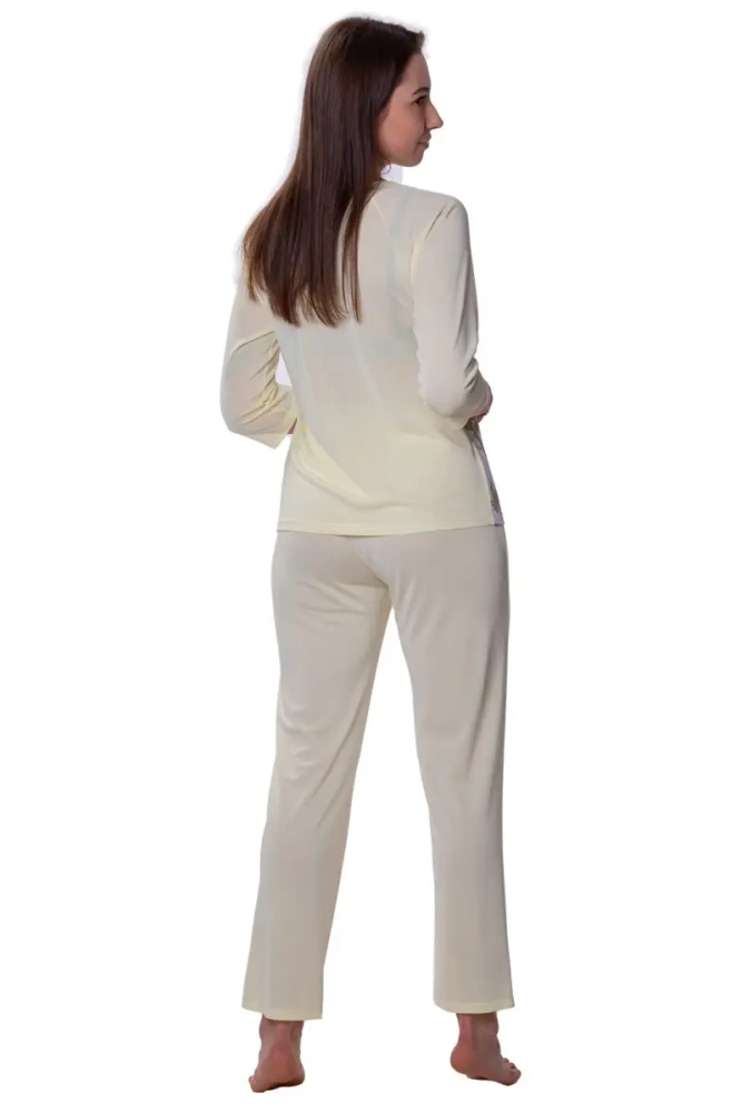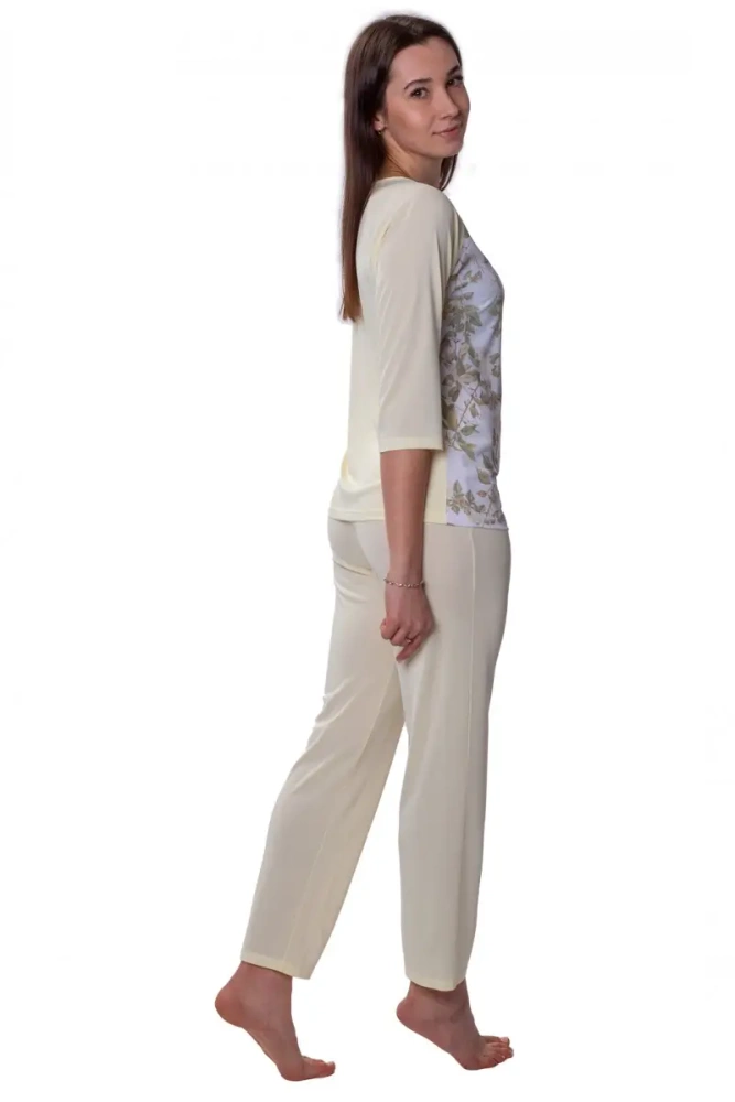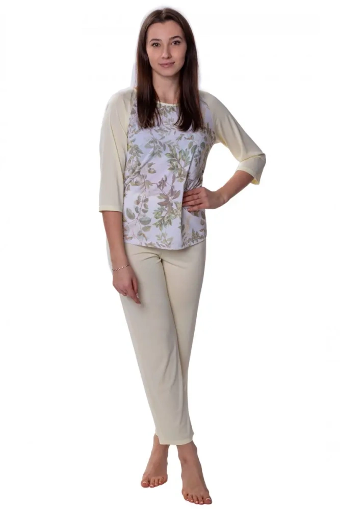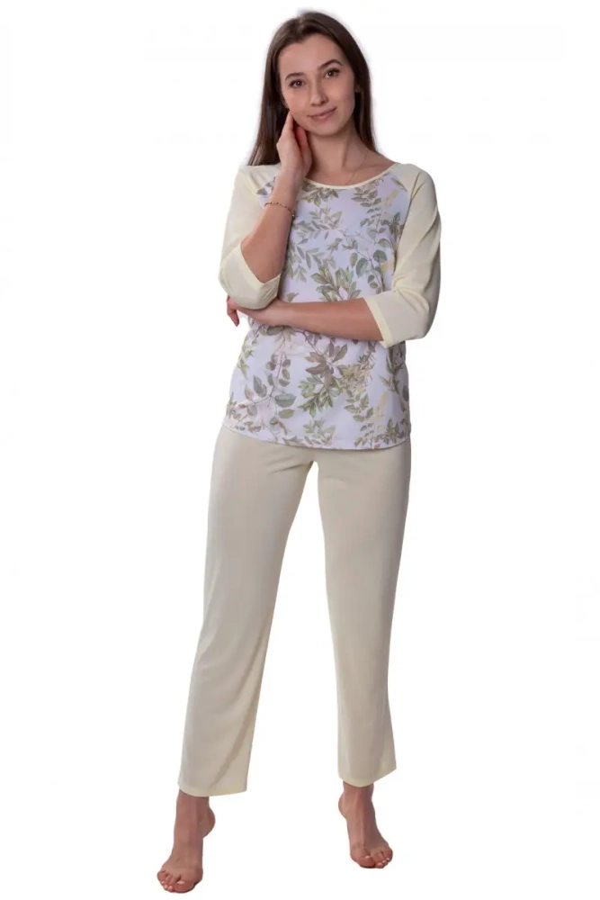 Zwiewna i przyjemna w dotyku piżama idealna na lato. Posiada botaniczne motywy w postaci delikatnych listków, co nadaje jej uroku. Rękawy oraz nogawki wykonane są z koordynatu, czyli gładkiej dzianiny w kolorze kremowym, pasującym do nadruku.