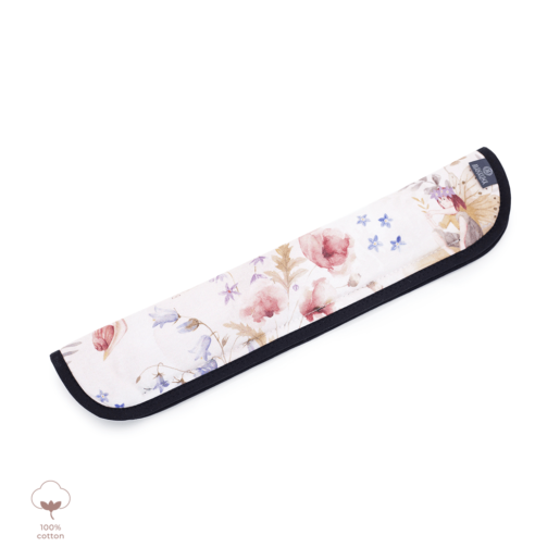 Ochraniacz na pałąk wózka, wykonany z miękkiej dzianiny bawełnianej, zapewniający komfort i ochronę podczas spacerów. Nowy kształt osłonki doskonale dopasowuje się do pałąka wózka, a bawełniana lamówka nadaje jej estetyczny wygląd. Wewnętrzna część ochraniacza wyposażona jest w ukryte zapięcie na rzep, a wypełnienie z antyalergicznej, lekkiej silikonowej włókniny zapewnia dodatkową miękkość.