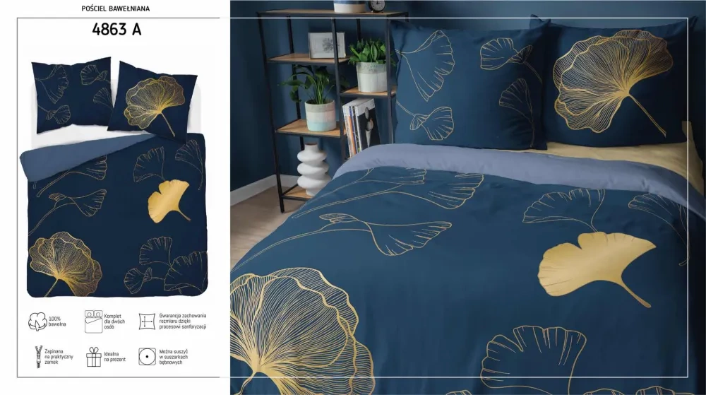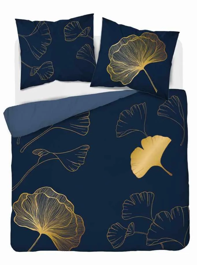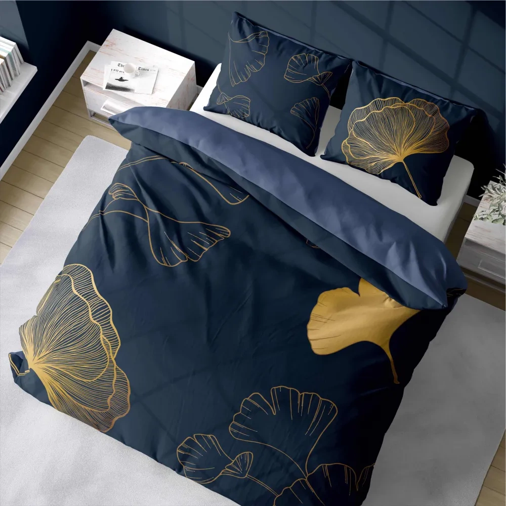 4863 A Holland Pościel bawełniana liście miłorzębu Detexpol granatowy