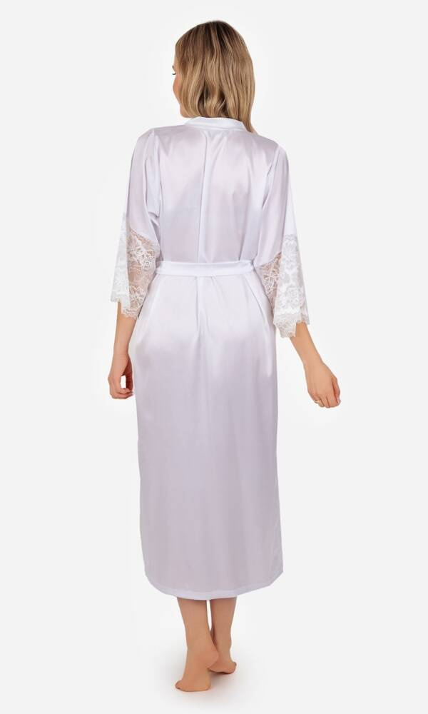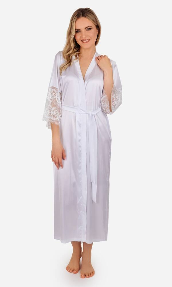 Szlafrok długi premium wykonany z przyjemniej w dotyku satyny włoskiej z obszyciem szerokiej koronki przy rękawie. Bez krępowania można go swobodnie założyć na bieliznę. Idealnie sprawdza się podczas przygotowań Panny Młodej, jak i świadkowej.