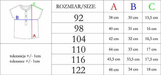 Wykonana ze 100% bawełny bluzka.  W modelu na tyle zastosowano zapięcie typu łezka, zapinane na bezniklowego napa.